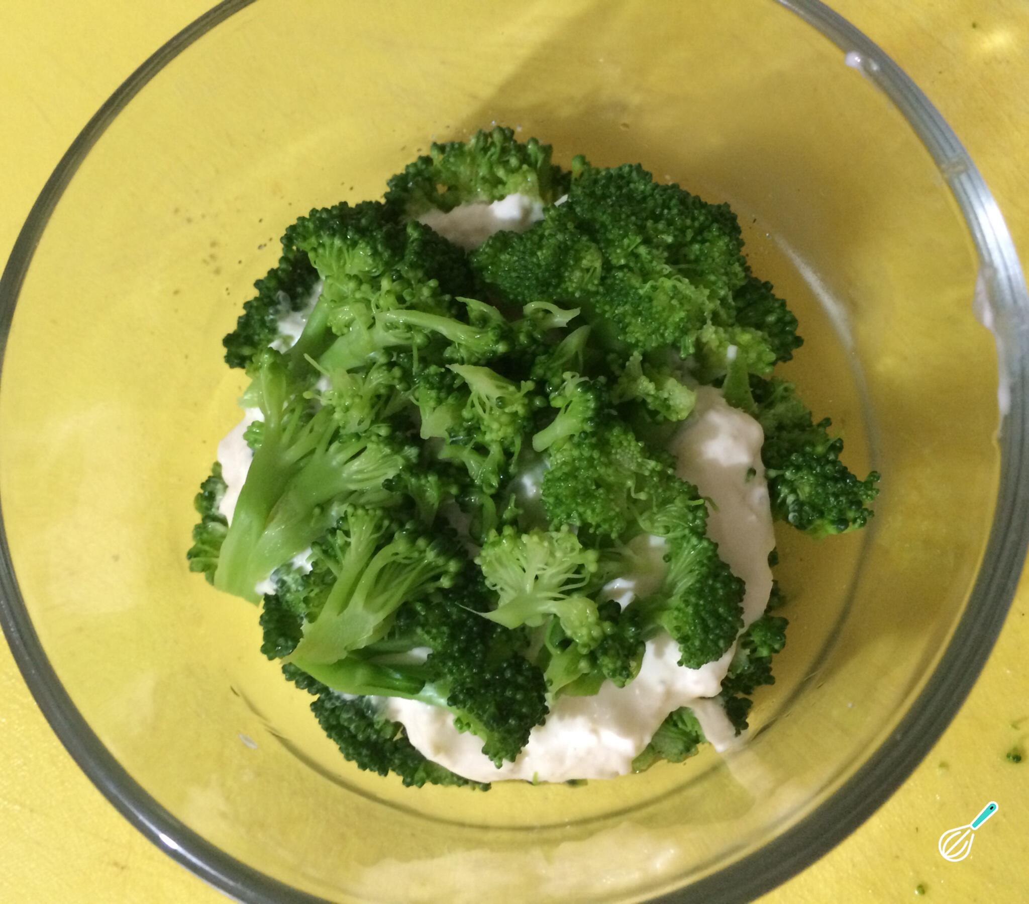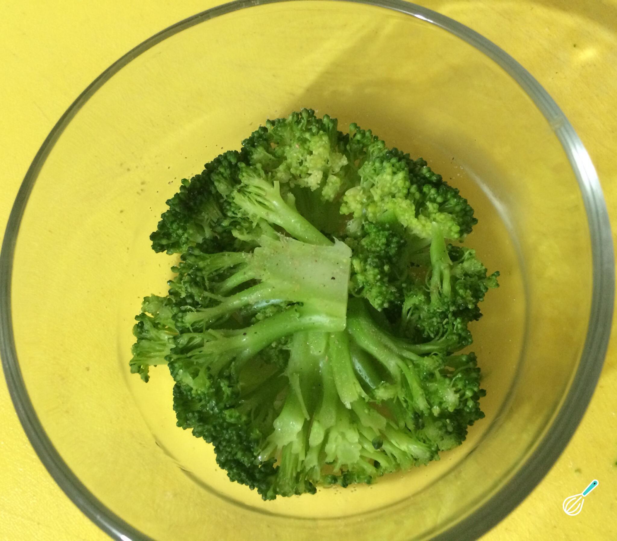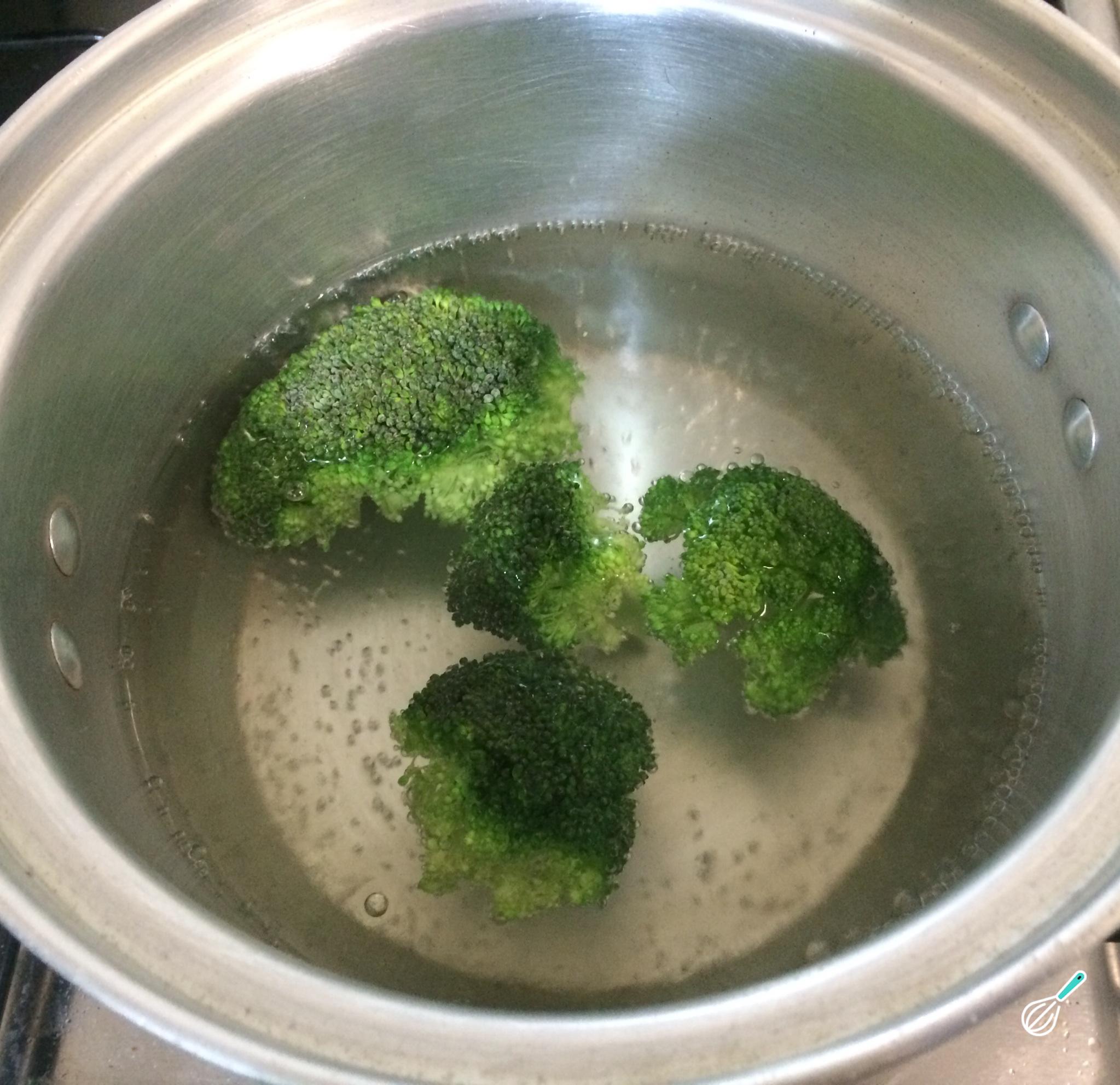 Em uma panela com água fervente e uma pitada de sal cozinhe o brócolis cortado em pedaços por 5 minutos. Como alternativa pode cozer o brócolis ao vapor.