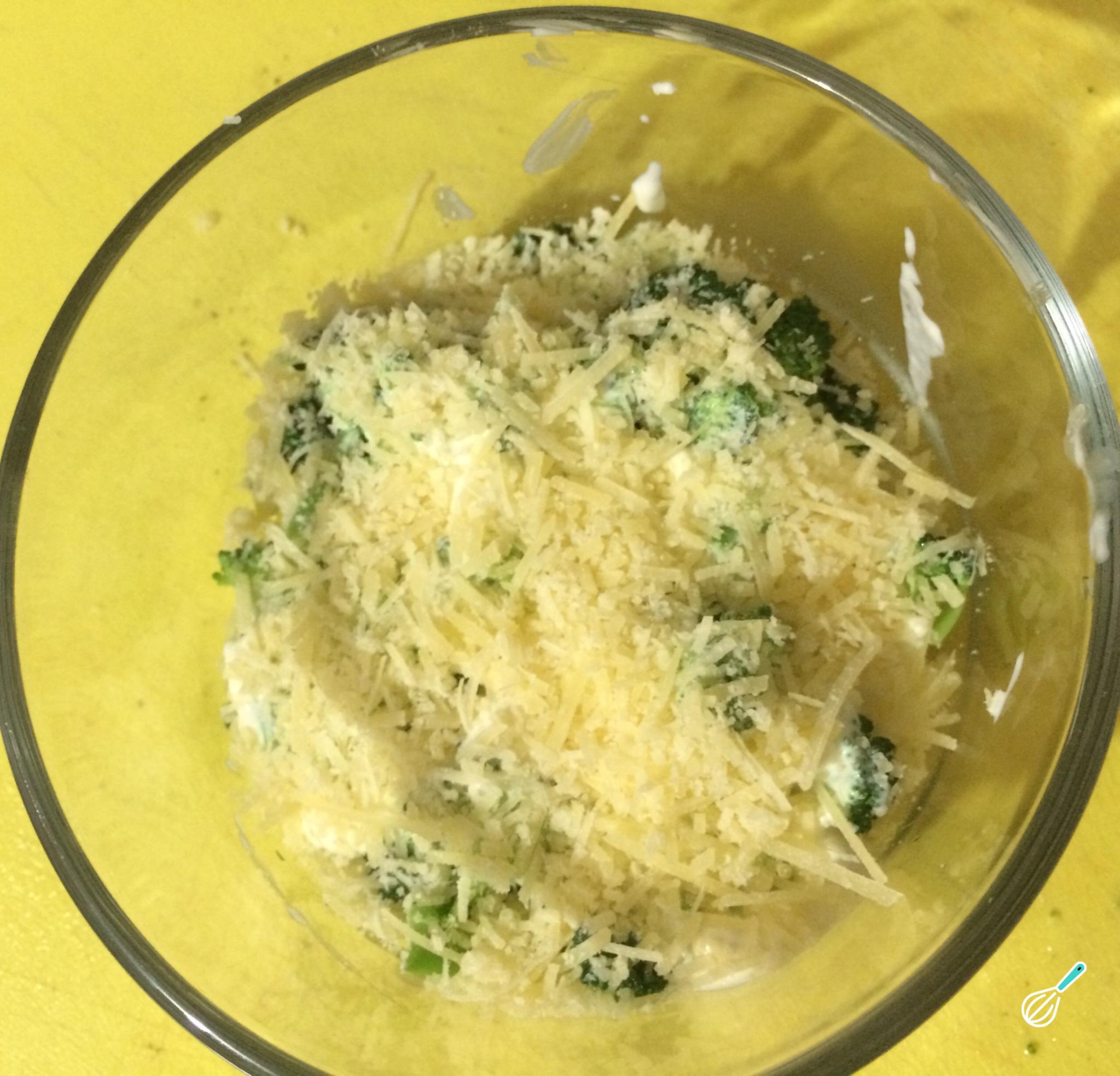 Misture o creme de leite ou o molho branco com metade do queijo ralado e adicione ao brócolis. Misture tudo para garantir que esse brócolis gratinado no forno fica bem cremoso.