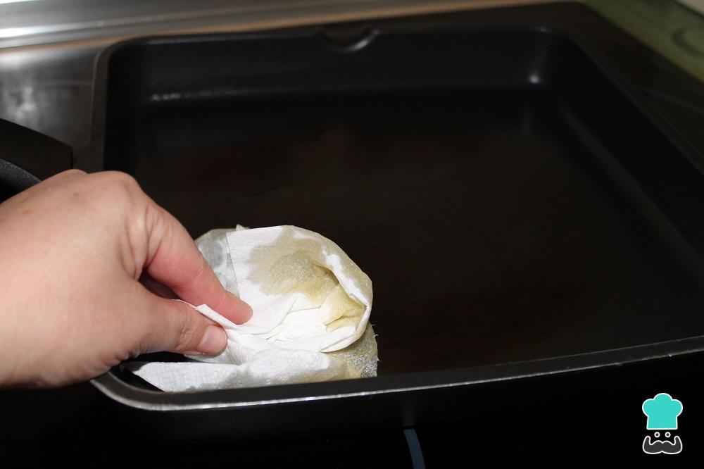 Coloque o azeite de oliva na grelha e espalhe com a ajuda de um guardanapo ou papel de cozinha. Unte bem todo o fundo e laterais da grelha com o azeite.