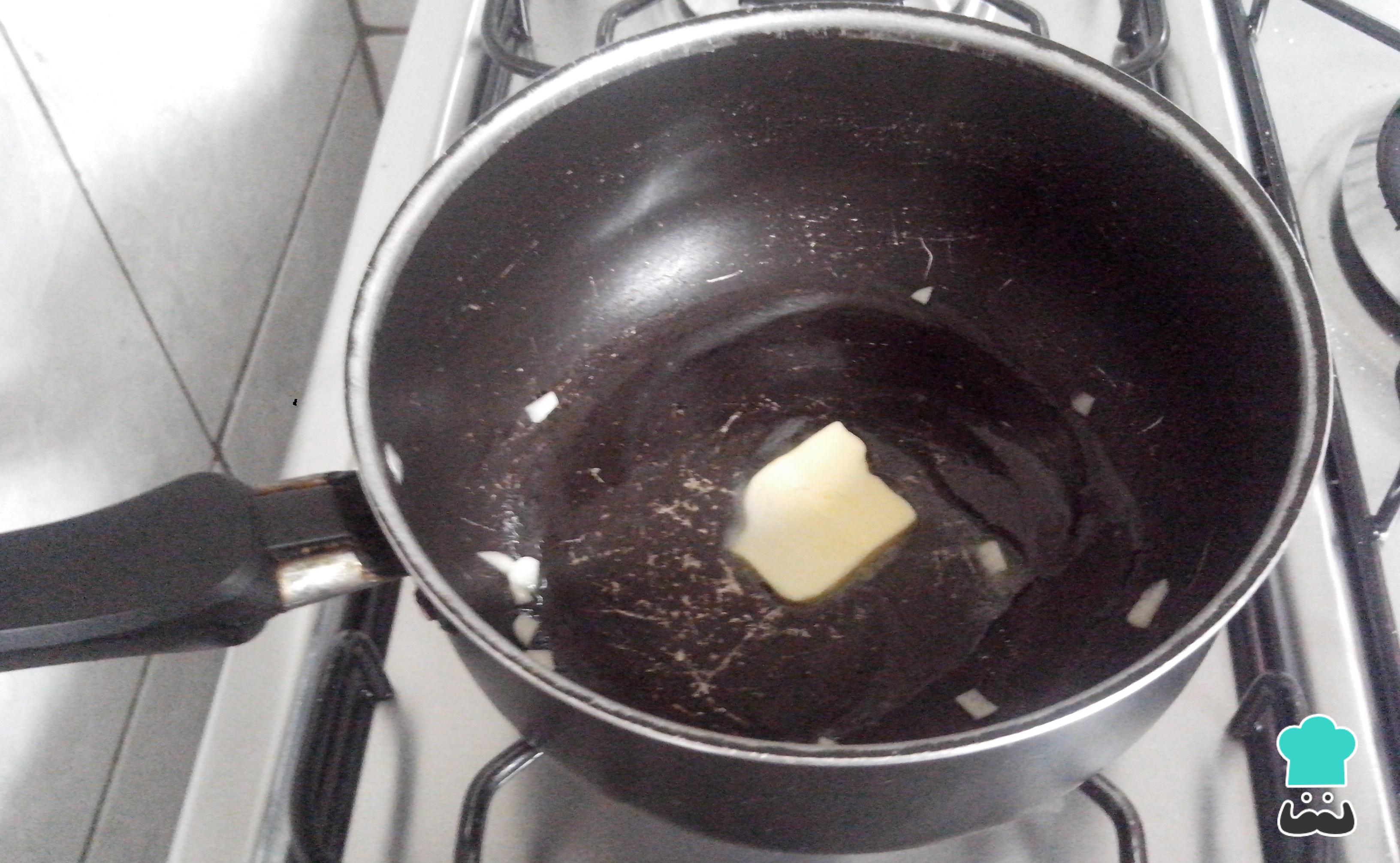 Para fazer esta receita de brócolis al dente numa panela coloque a manteiga e o alho cortado em cubinhos.