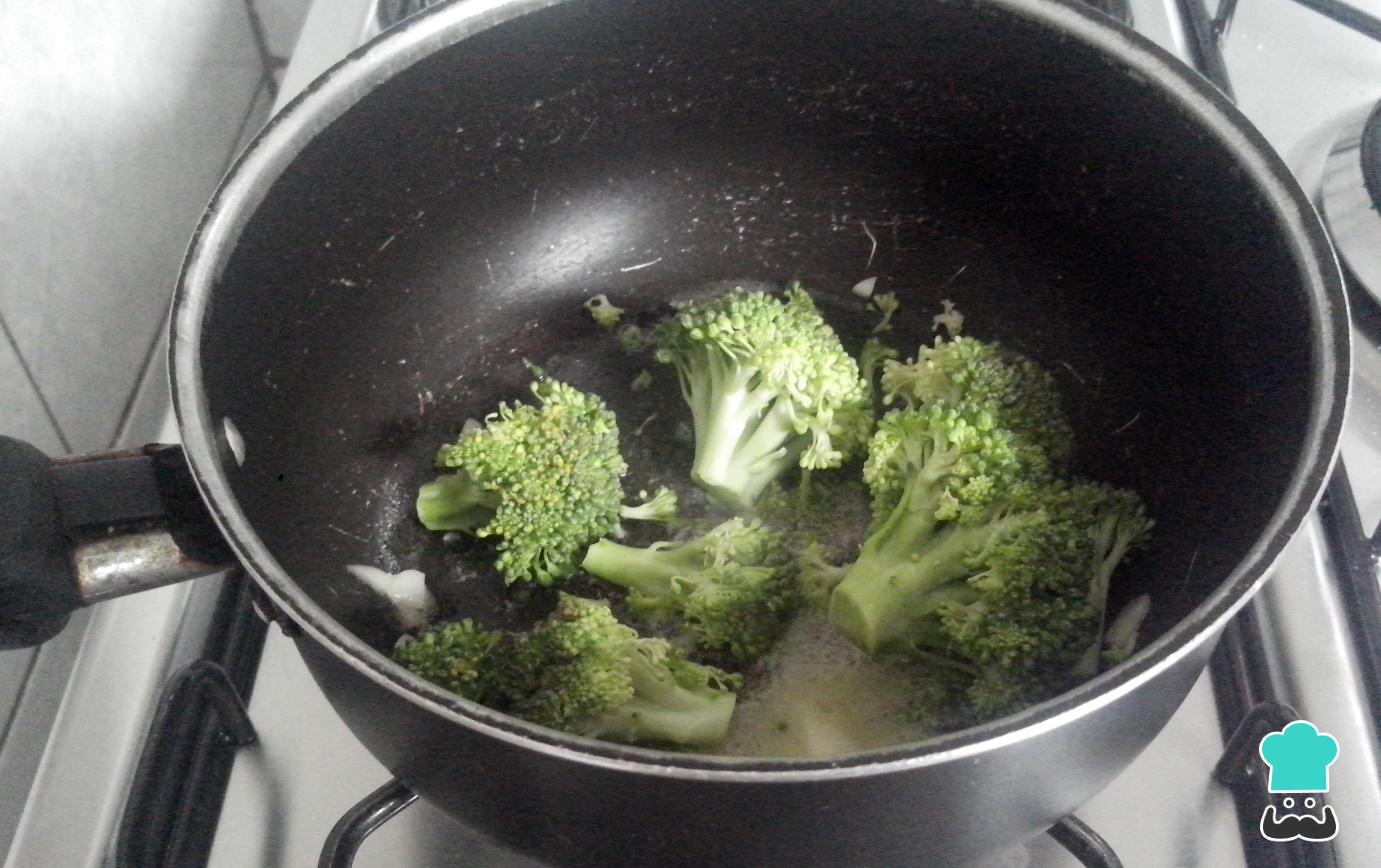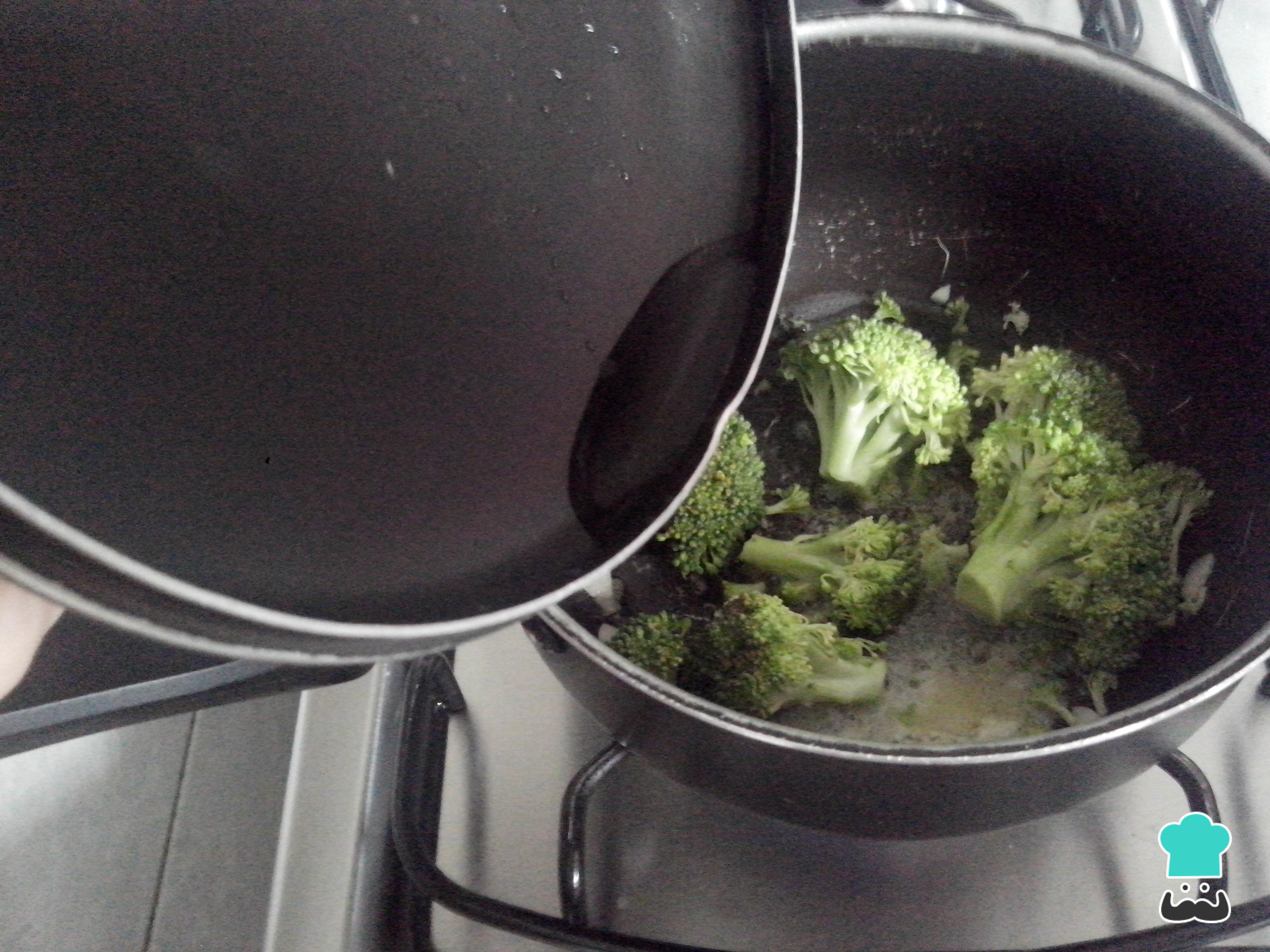 Leve ao fogo, coloque o brócolis lavado e cortado em floretes e dê uma refogada.