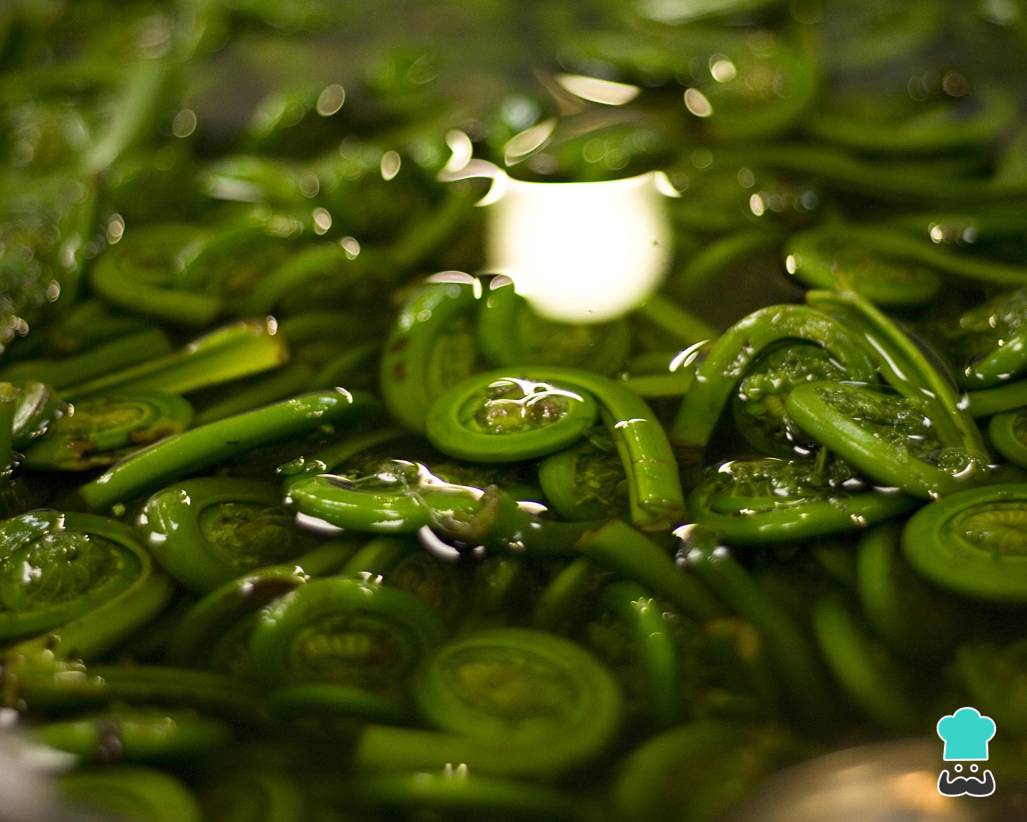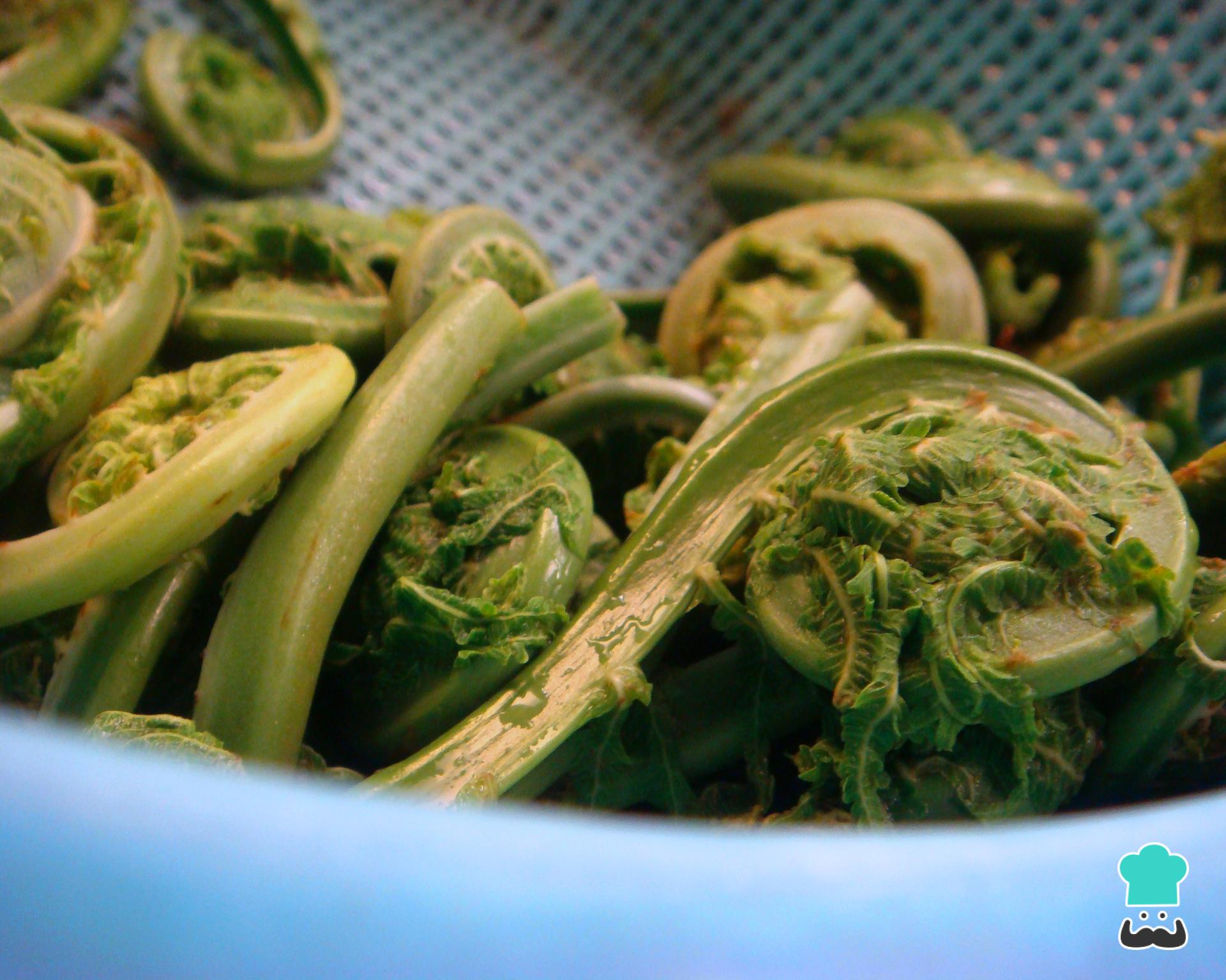 Para eliminar o amargo e a toxicidade da samambaia coloque os brotos numa panela com água até cobrir e adicione 1 colher de sopa de bicarbonato de sódio. Deixe até ferver e escorra, desprezando a água. Enxague os brotos e repita o procedimento mais duas vezes com água filtrada e 1 colher de sopa de bicarbonato de sódio de cada vez.