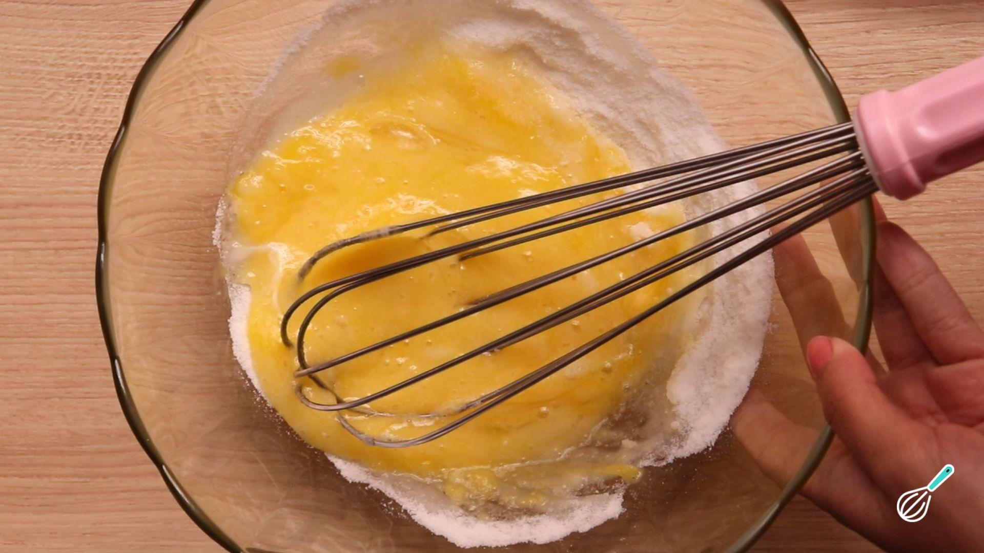Em uma tigela grande, bata bem os ovos com o açúcar. Em seguida adicione o óleo.
