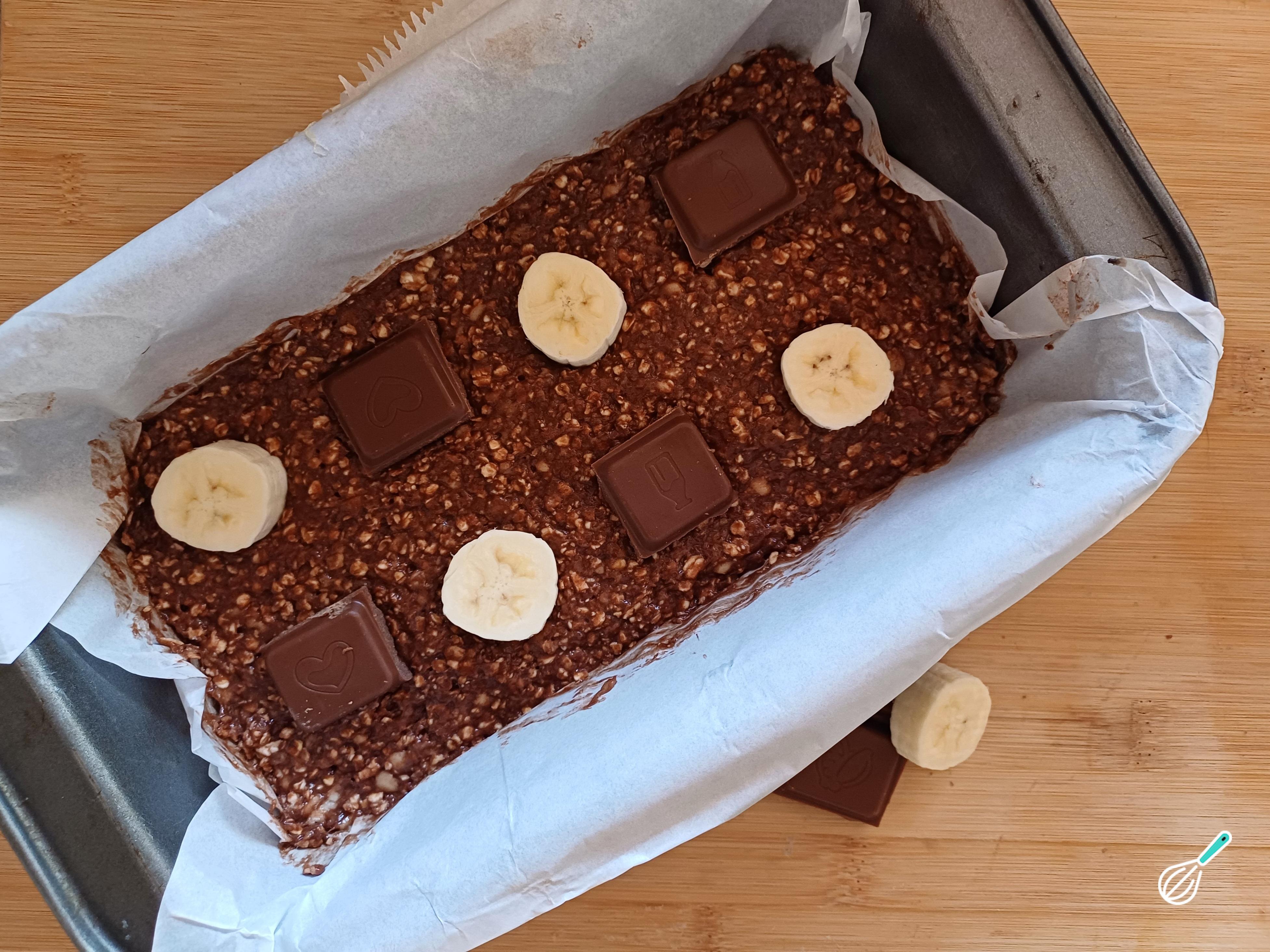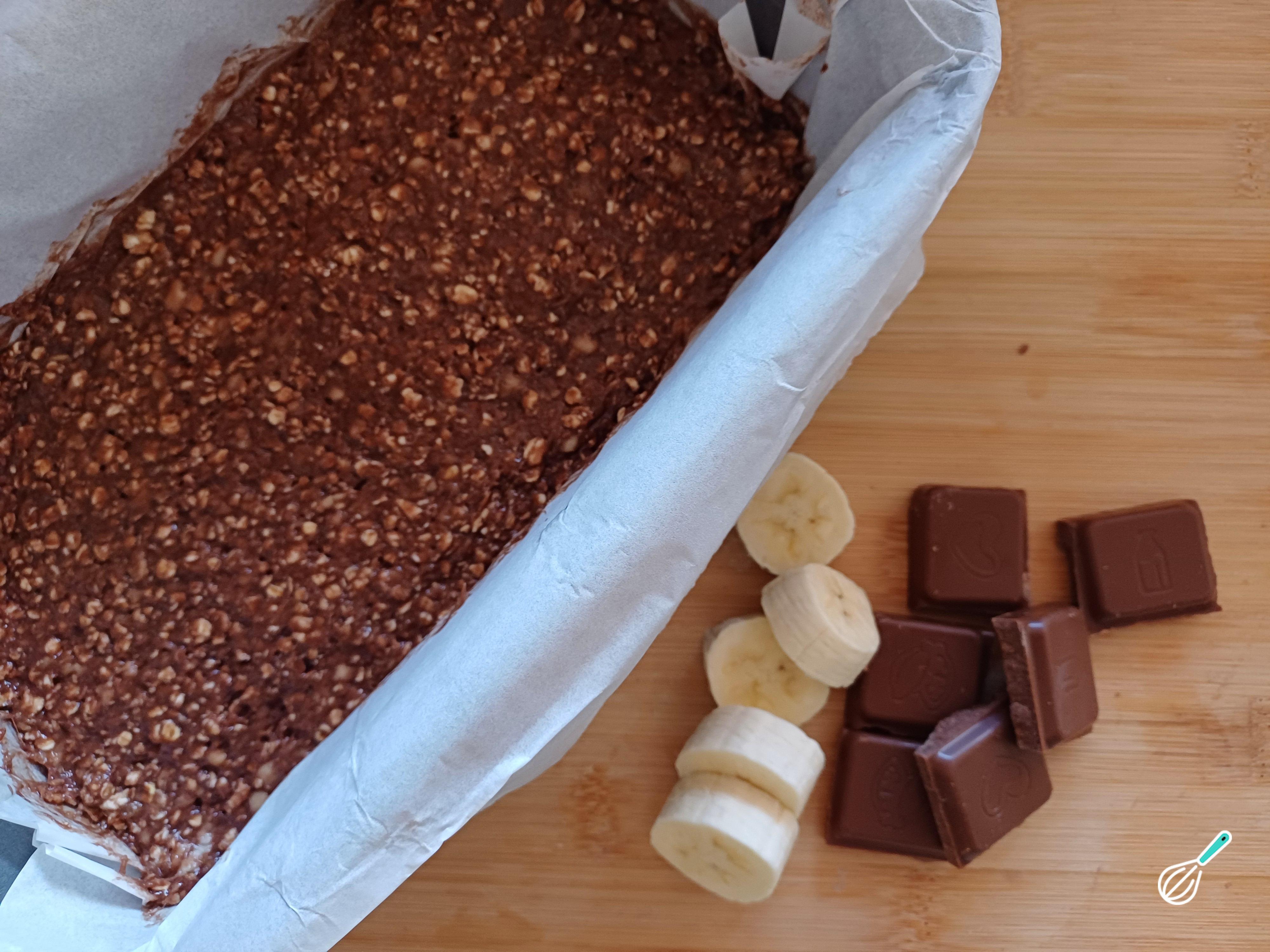 Transfira a mistura para uma forma de bolo inglês forrada com papel manteiga, nivelando bem com uma espátula de maneira uniforme. Pique o chocolate ao leite e uma banana em rodelas.