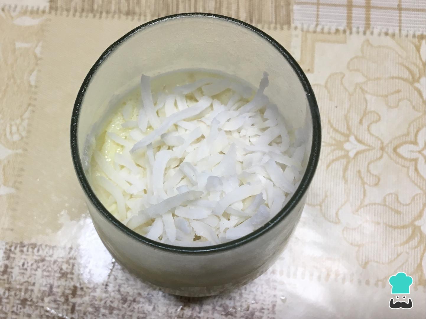 Para a cobertura, que torna este brownie de microondas ainda mais irresistível, bata a água quente com o leite em pó e o xylitol no liquidificador. Depois, junte essa mistura com o coco e deixe no congelador por 20 minutos, para endurecer.