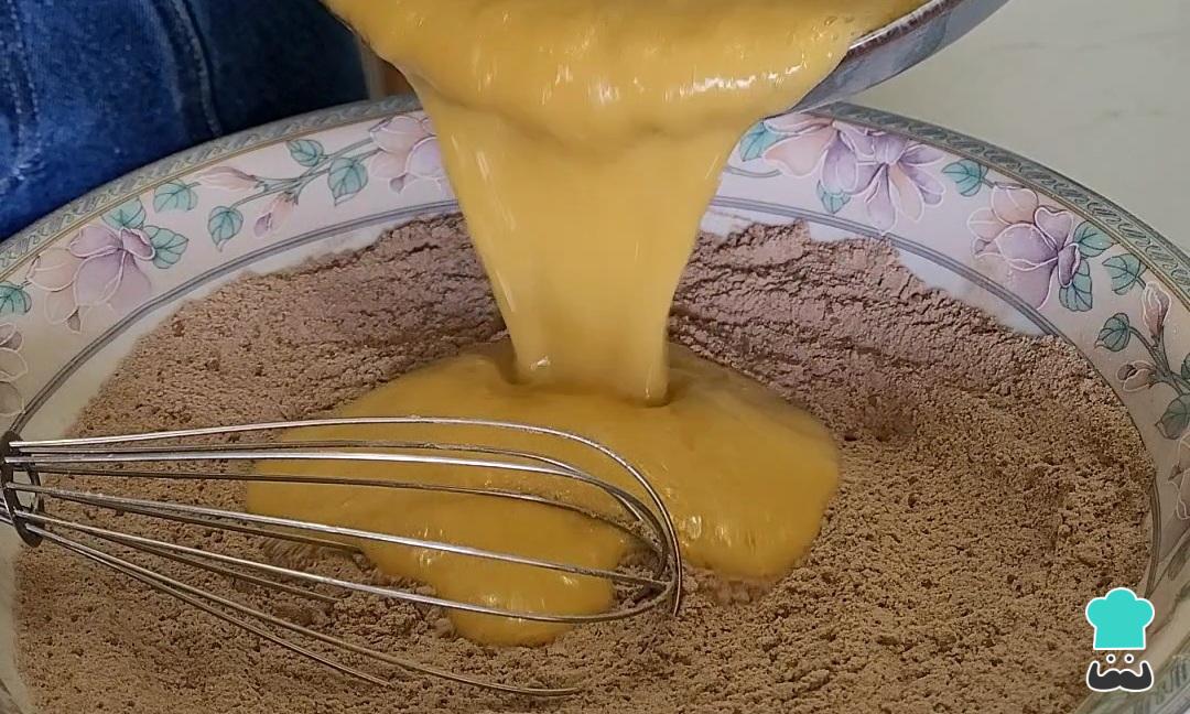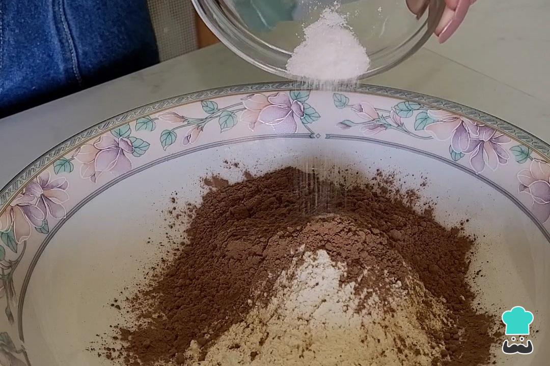 Em um recipiente, comece misturando a farinha de trigo, o cacau em pó e o sal. Reserve. Dica: Aqui, gosto de utilizar o fouet para a mistura ficar bem uniforme e sem grumos.