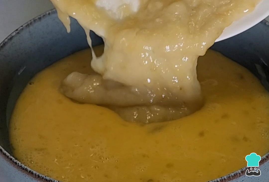 Em outro recipiente, bata os ovos com auxílio de um garfo e depois acrescente a banana bem amassada. Reserve.