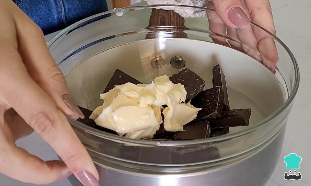 Coloque o chocolate 53% e a manteiga em uma tigela de vidro e leve para derreter em banho maria. Misture.