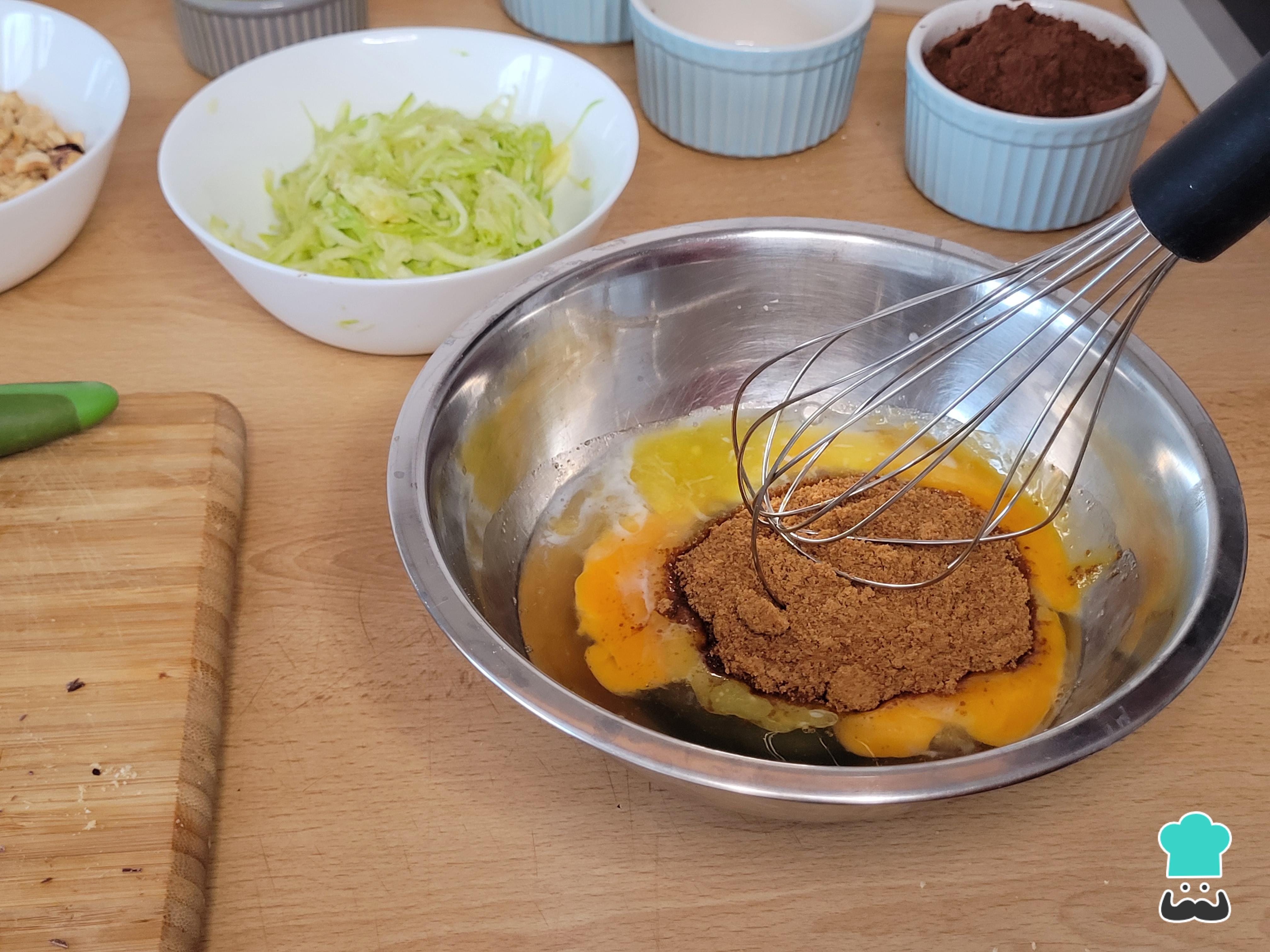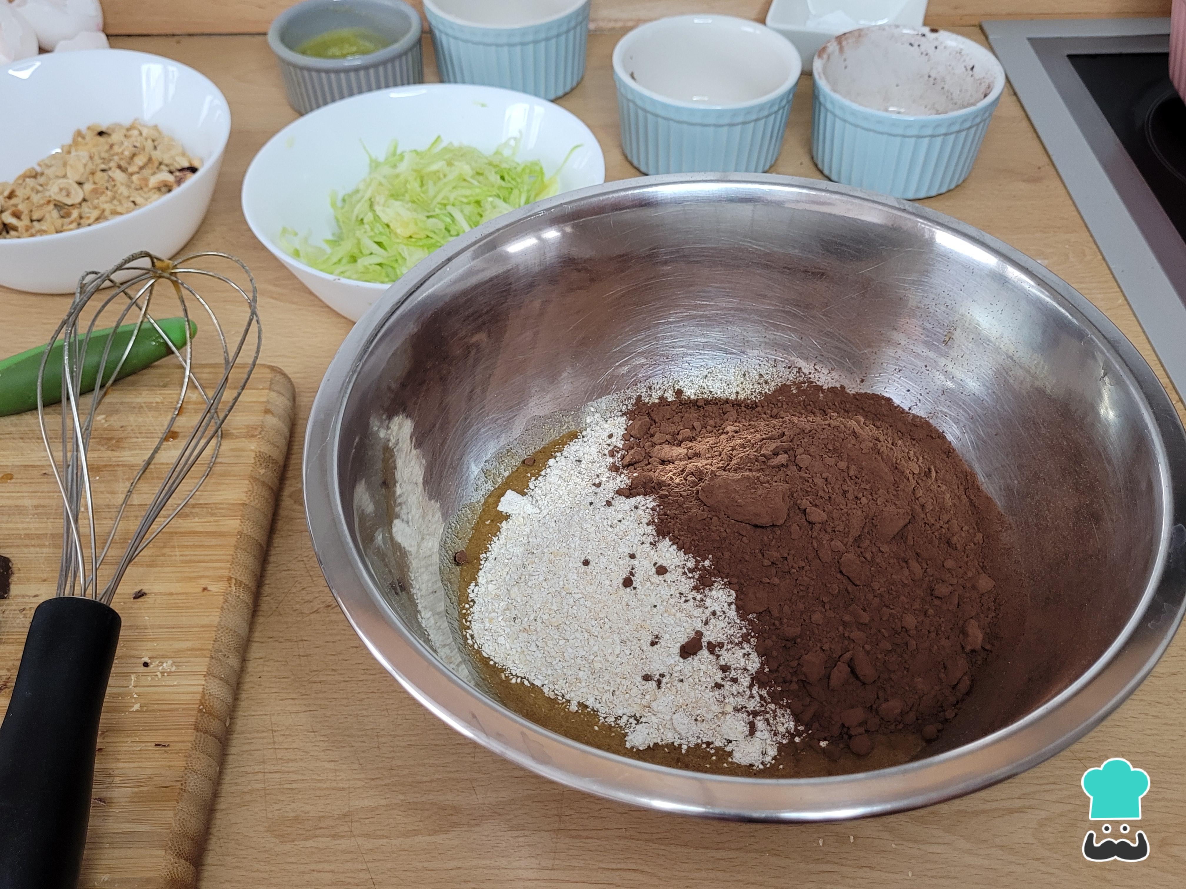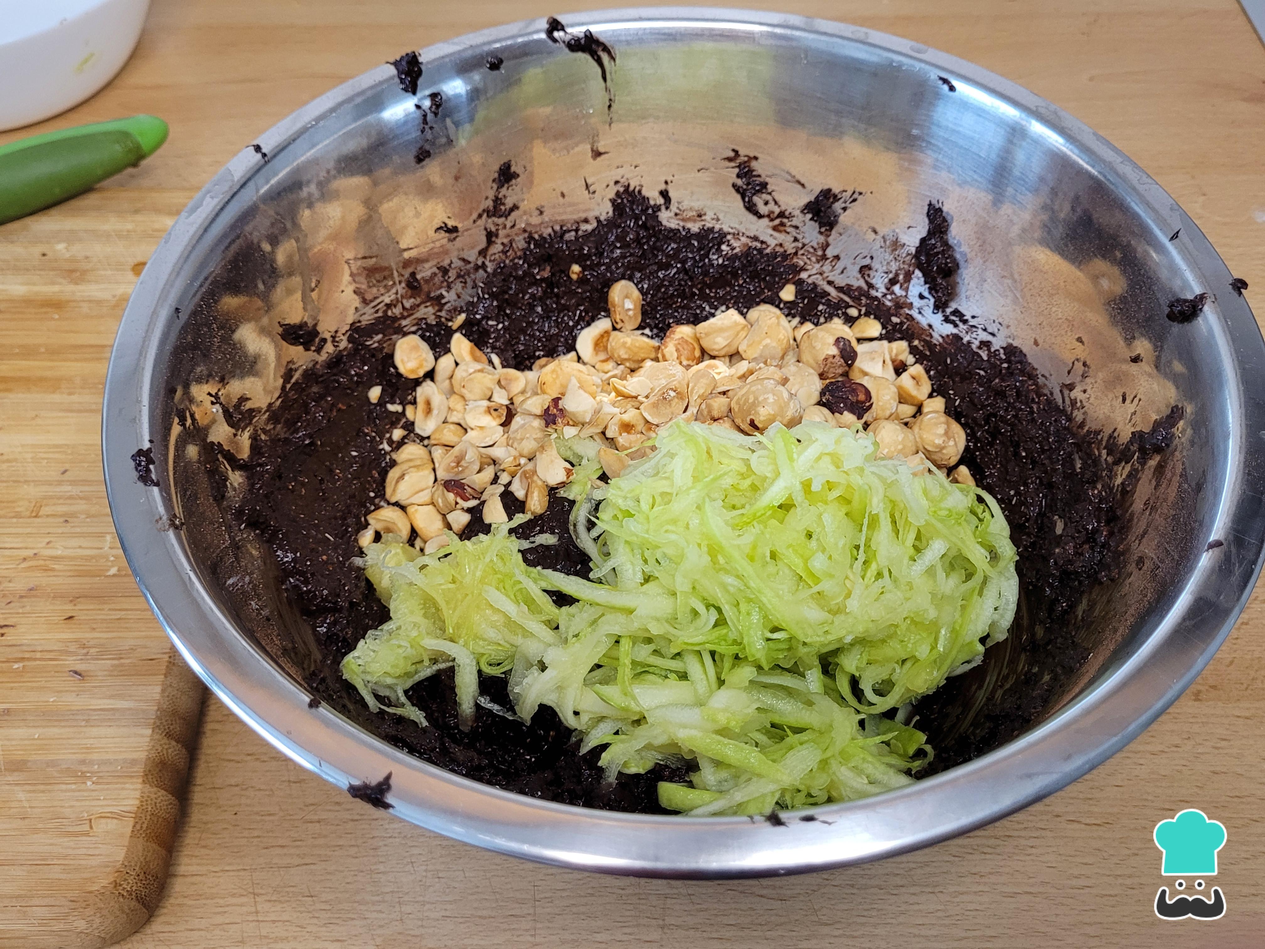 Adicione o bicarbonato de sódio, misture com uma espátula e em seguida adicione a abobrinha ralada, e as avelãs. Misture bem.