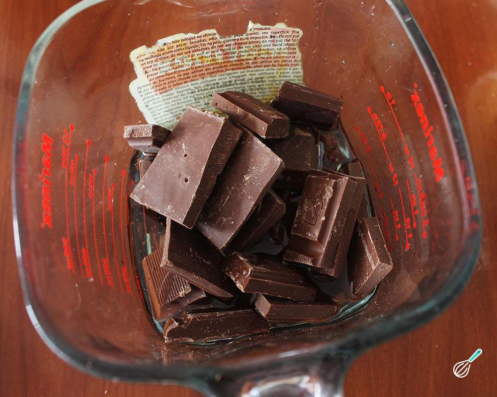 Noutro recipiente coloque o chocolate picado e o óleo restante. Leve para esquentar no microondas em potência máxima por 30 segundos. Retire, misture e devolva ao microondas por mais 30 segundos ou até o chocolate derreter completamente. Retire, misture e deixe esfriar um pouco.