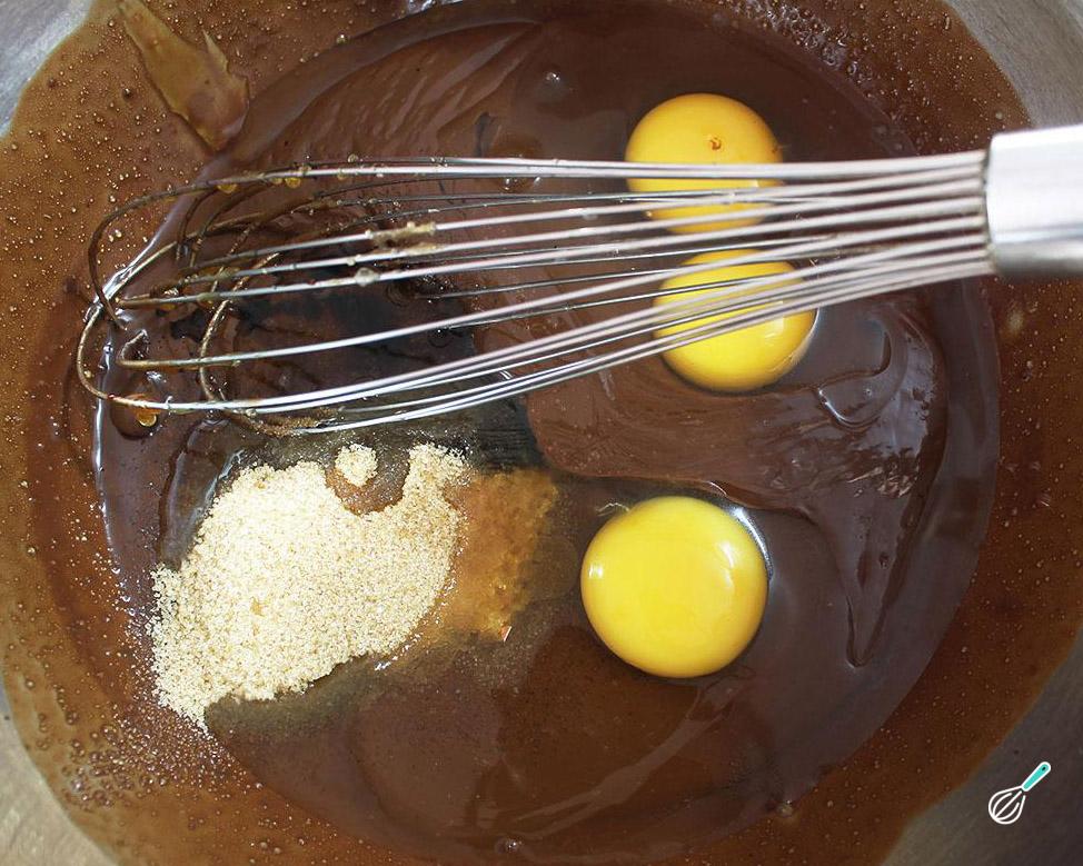 Depois do passo anterior acrescente os ovos e o açúcar no chocolate derretido. Misture bem até obter uma massa densa, mas homogênea.