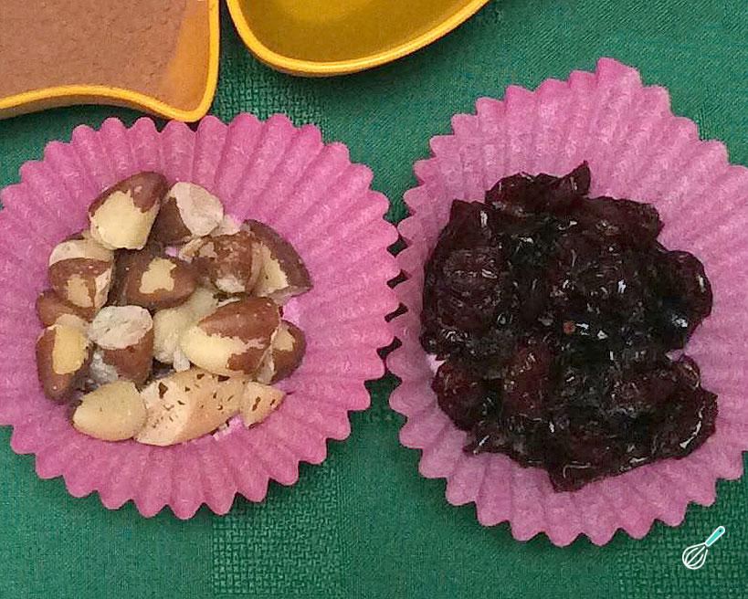 Para conferir mais crocância e nutrientes nesta massa de brownie fit, adicione as nozes ou castanhas picadas. Também vale a pena acrescentar cranberry ou uva passa para conferir mais doçura na massa! Misture bem.