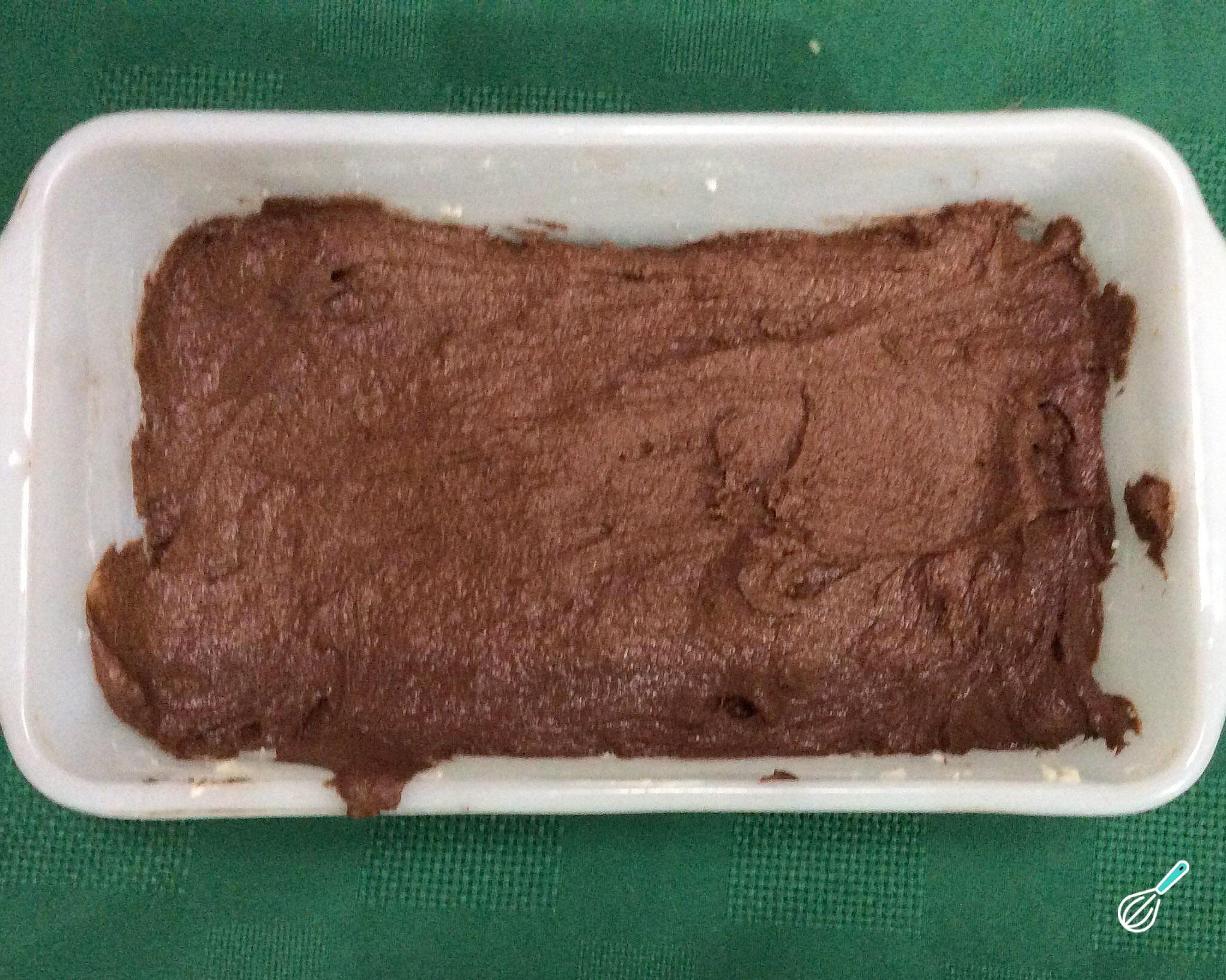 Coloque a massa deste brownie saudável numa forma muito bem untada com azeite ou óleo e polvilhada com farinha de aveia. Pode usar uma forma redonda pequena de 20-22 cm ou, como no caso, uma assadeira de aproximadamente 15 x 20 cm.