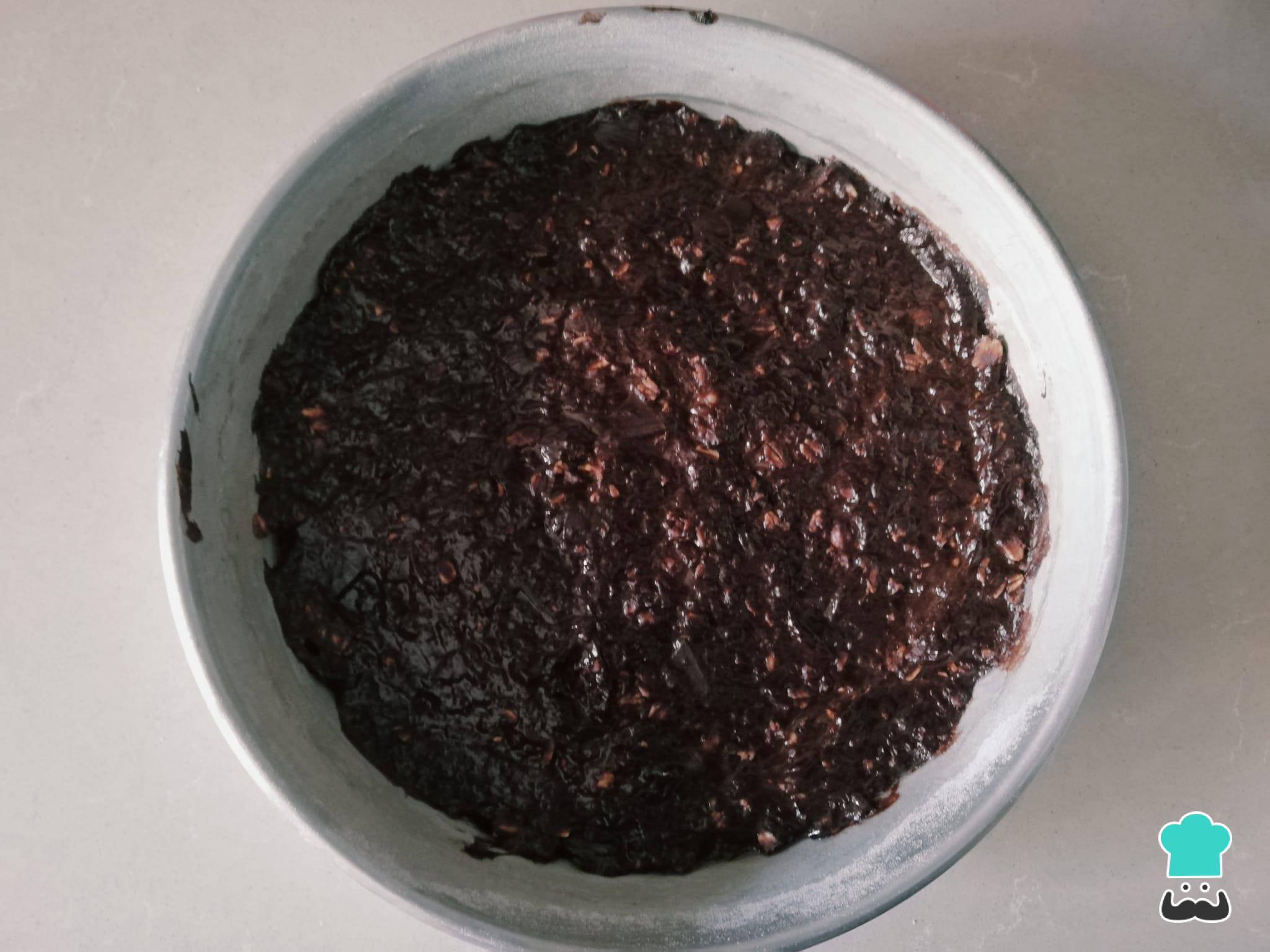 Assim que todos os ingredientes estiverem bem misturados, transfira a massa do brownie vegano para uma forma untada e polvilhada com farinha de aveia.