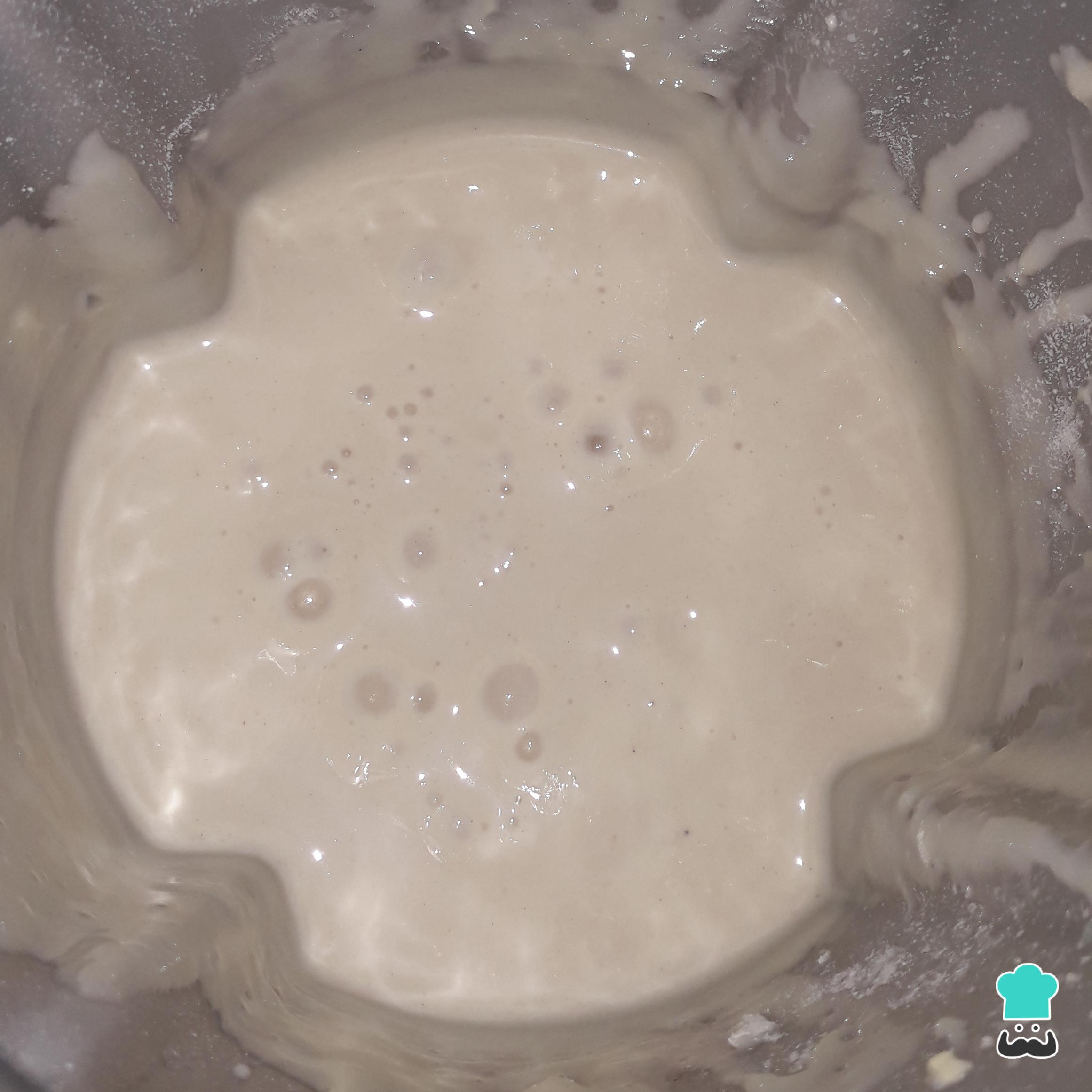 Em um liquidificador bata todos os ingredientes até obter uma massa lisa: a farinha de trigo, o leite em pó, a manteiga, o açúcar, o fermento, a água e o ovo.
