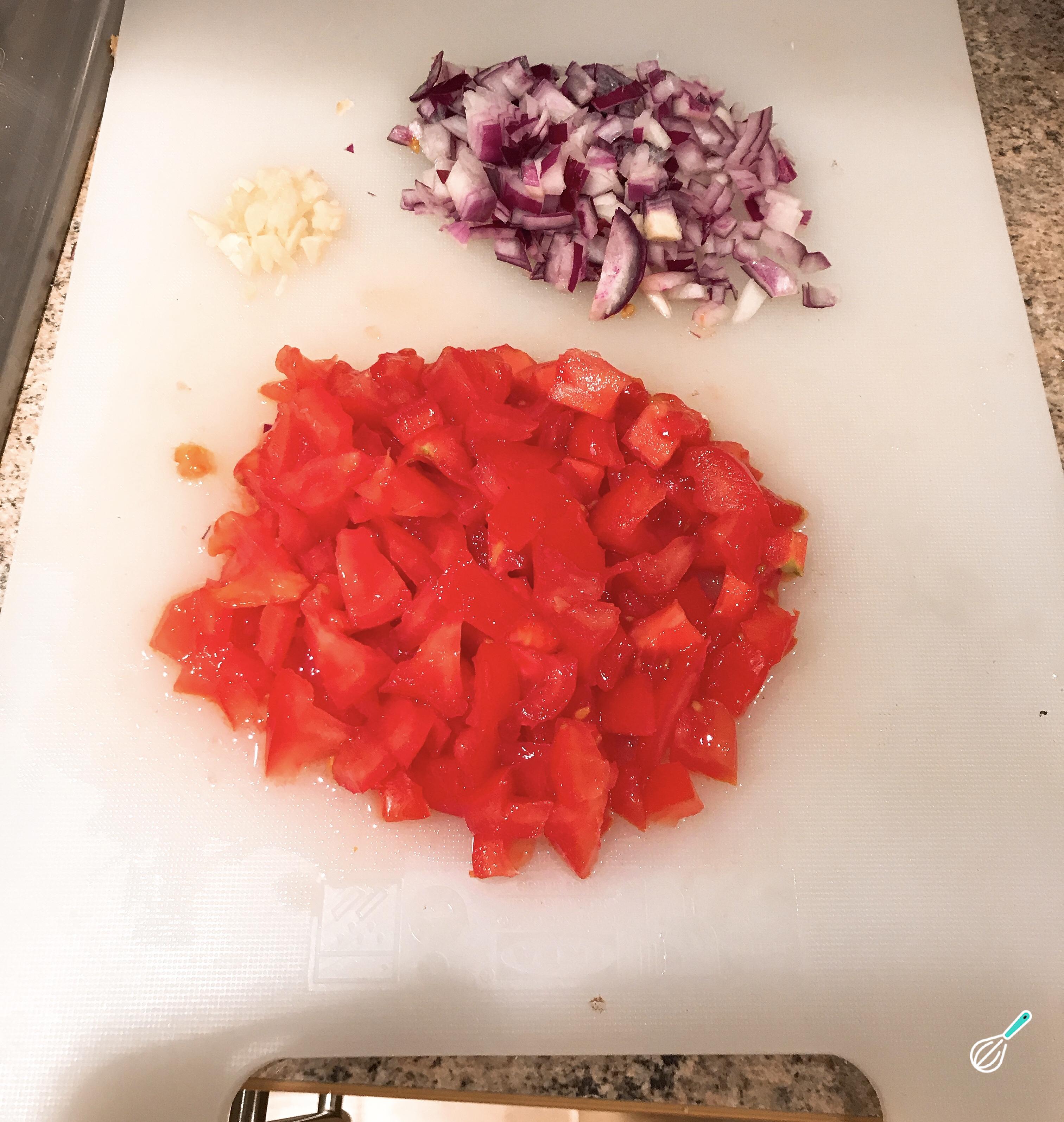 Para fazer esta receita de bruschetta italiana pique os tomates (com casca e sementes) em cubos, a cebola finamente e o dente de alho bem fininho também.
