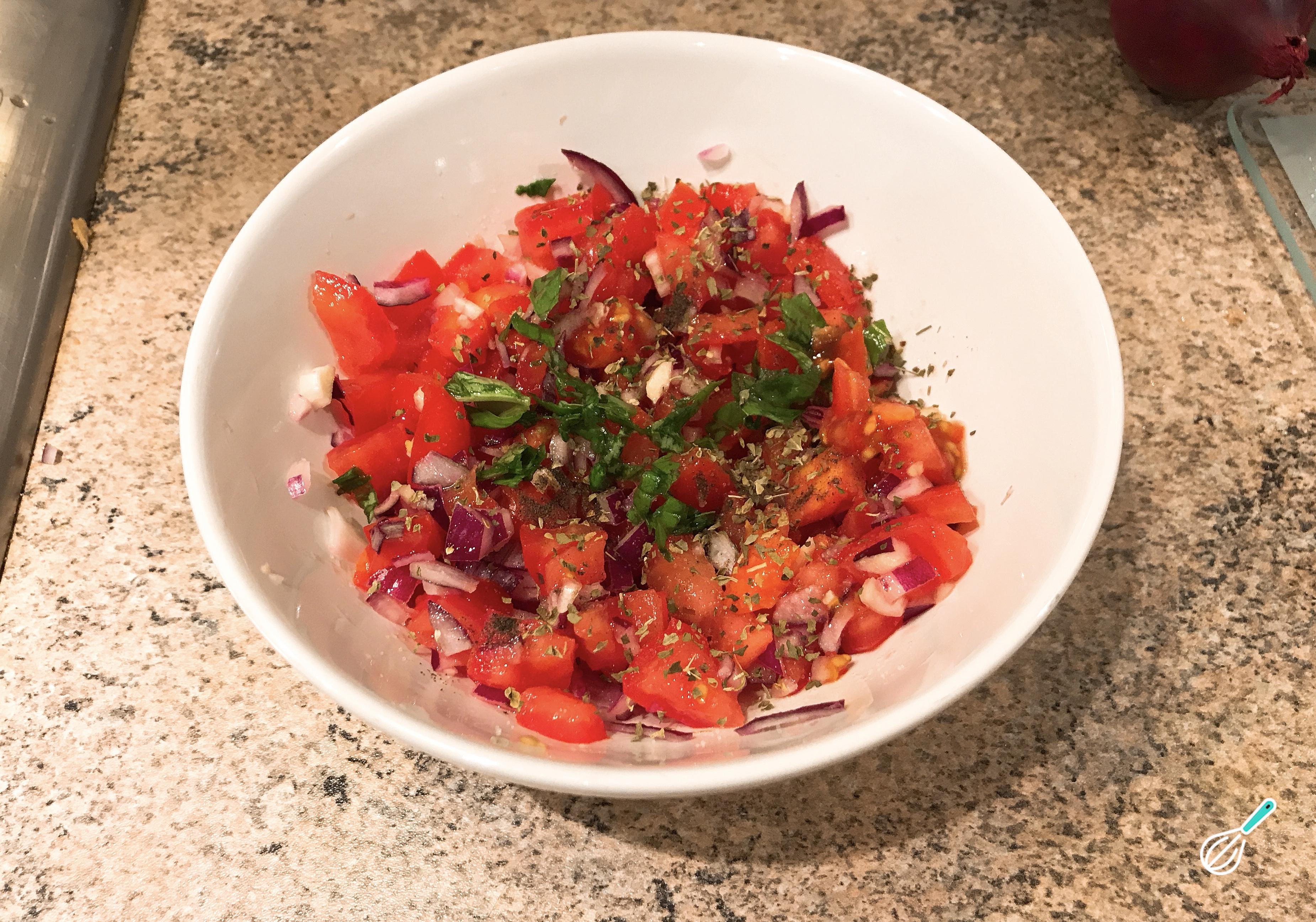 Agora despeje tudo em uma tigelinha, misture e tempere com orégano, sal, manjericão picadinho e pimenta do reino. Depois adicione um fio de azeite e deixe marinando por uns 10 minutos, para pegar bem os sabores.
