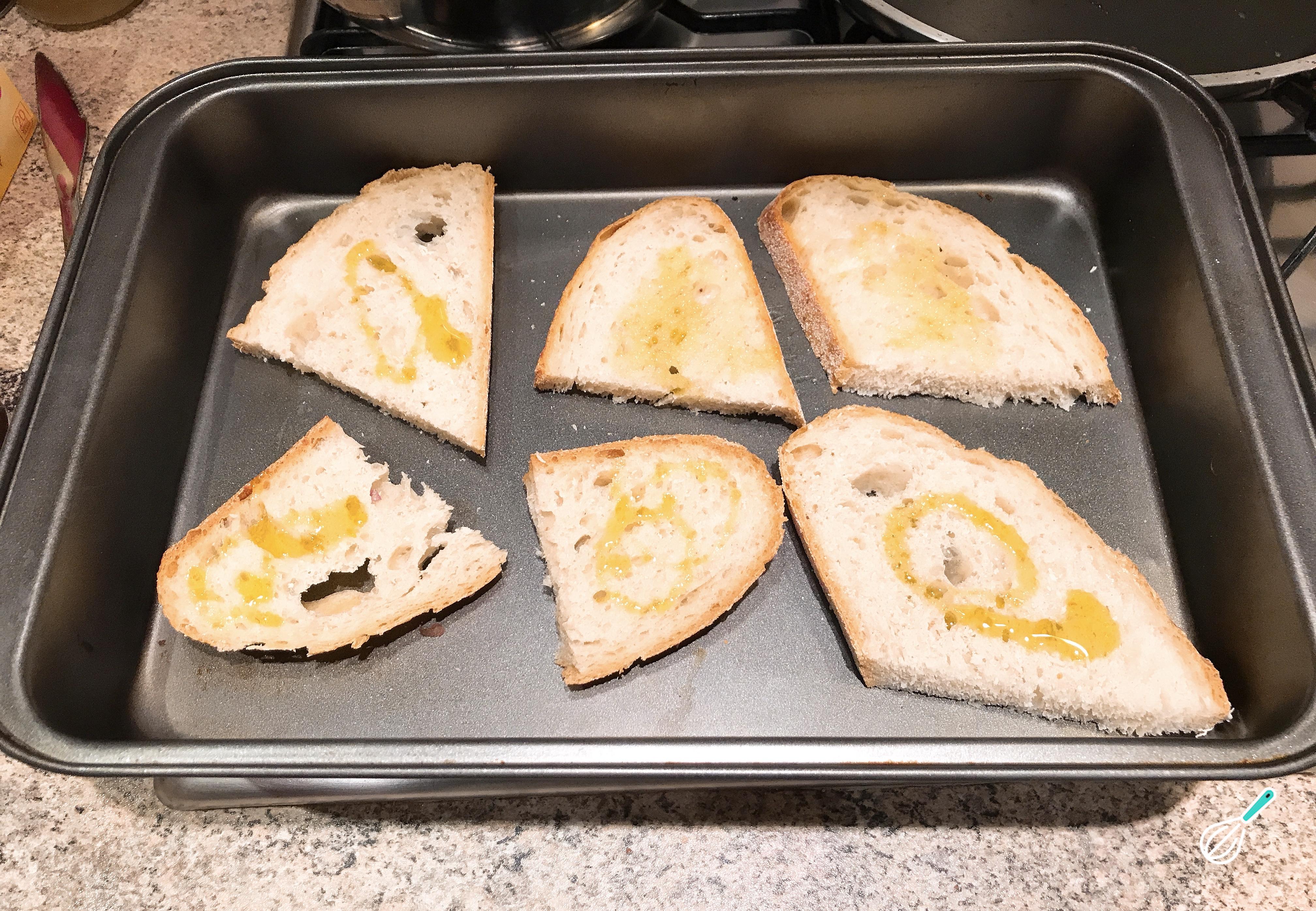 Enquanto os tomates marinam, leve ao forno as fatias de pão italiano regados com um fio de azeite, para aquecer. Deixe em forno pré-aquecido a 200ºC por uns 10 minutos. Em seguida, retire do forno e, com ajuda de uma colher, distribua os tomates sobre as fatias de pão italiano.