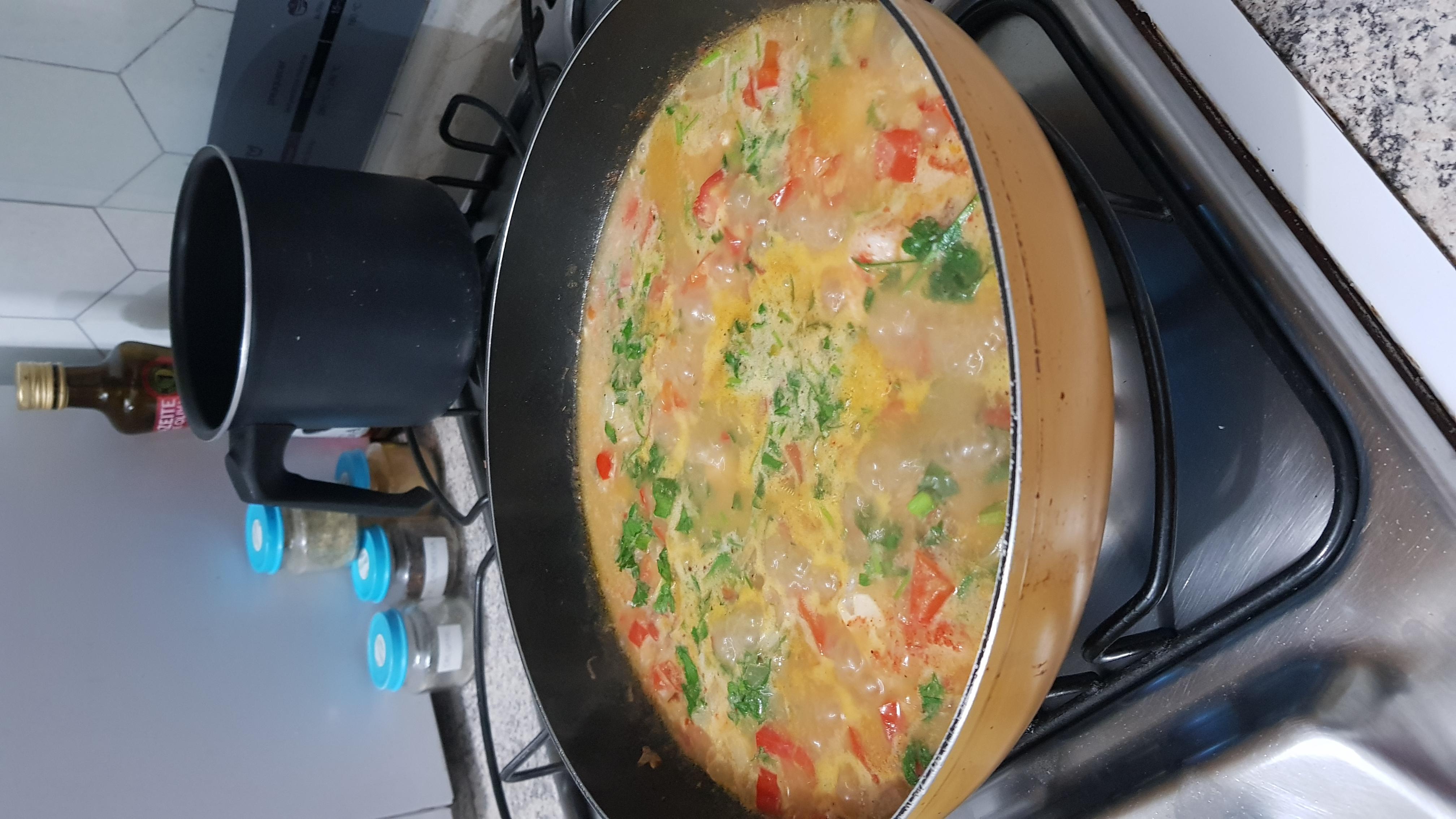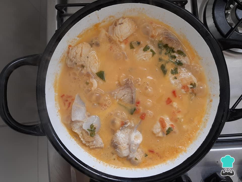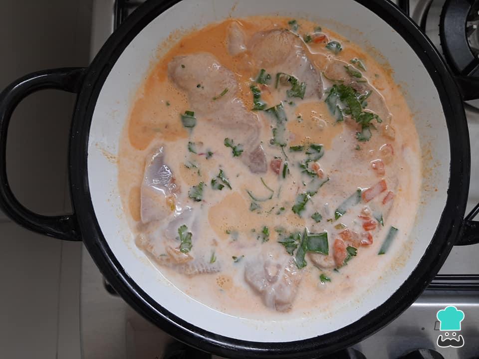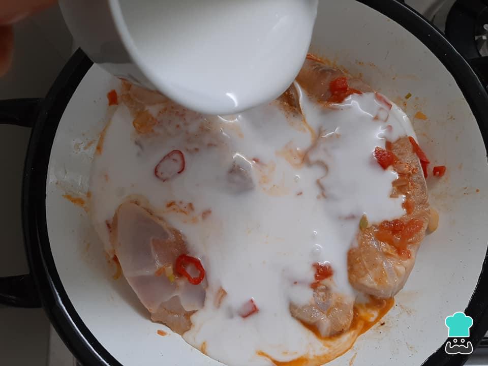 Seguidamente adicione o leite de coco, cobrindo todas as postas de cação.