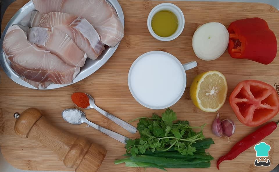Separe os ingredientes necessários para preparar a receita de cação ensopado ao leite de coco.