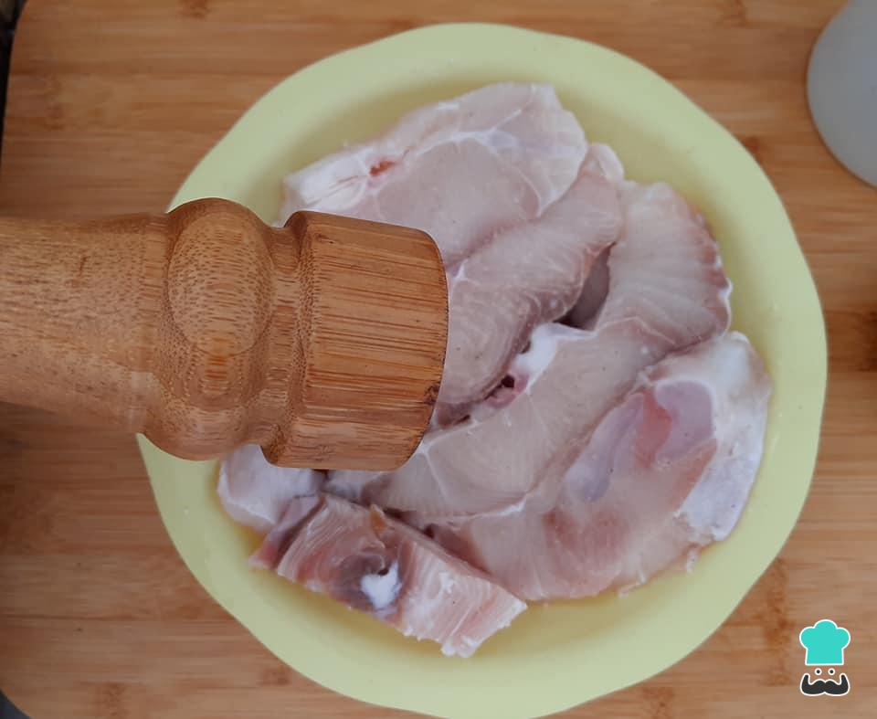Tempere as postas do cação com sal e pimenta do reino e deixe pegar o sabor por uns 10 minutos.
