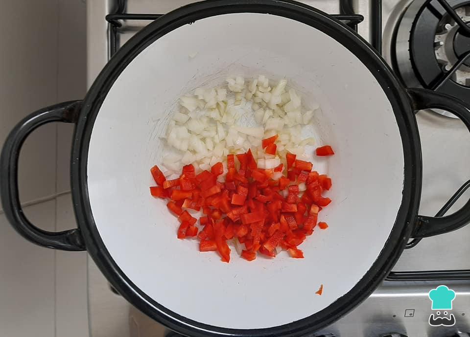 Numa panela média, aquecida, acrescente o azeite de oliva e refogue a cebola e o pimentão vermelho.