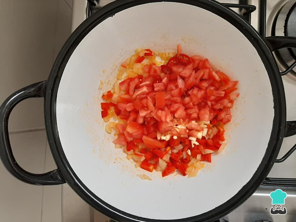 Acrescente a pimenta, o tomate e os alhos picados e refogue mais um pouco.