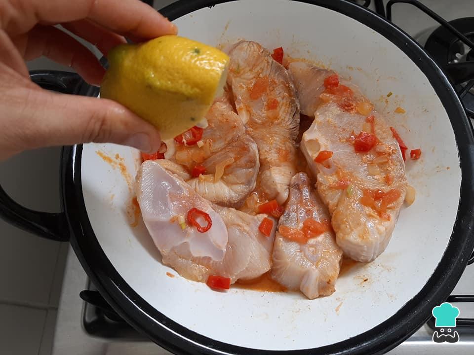 Adicione as postas, envolvendo-as ao refogado delicadamente. Regue com o suco do limão.