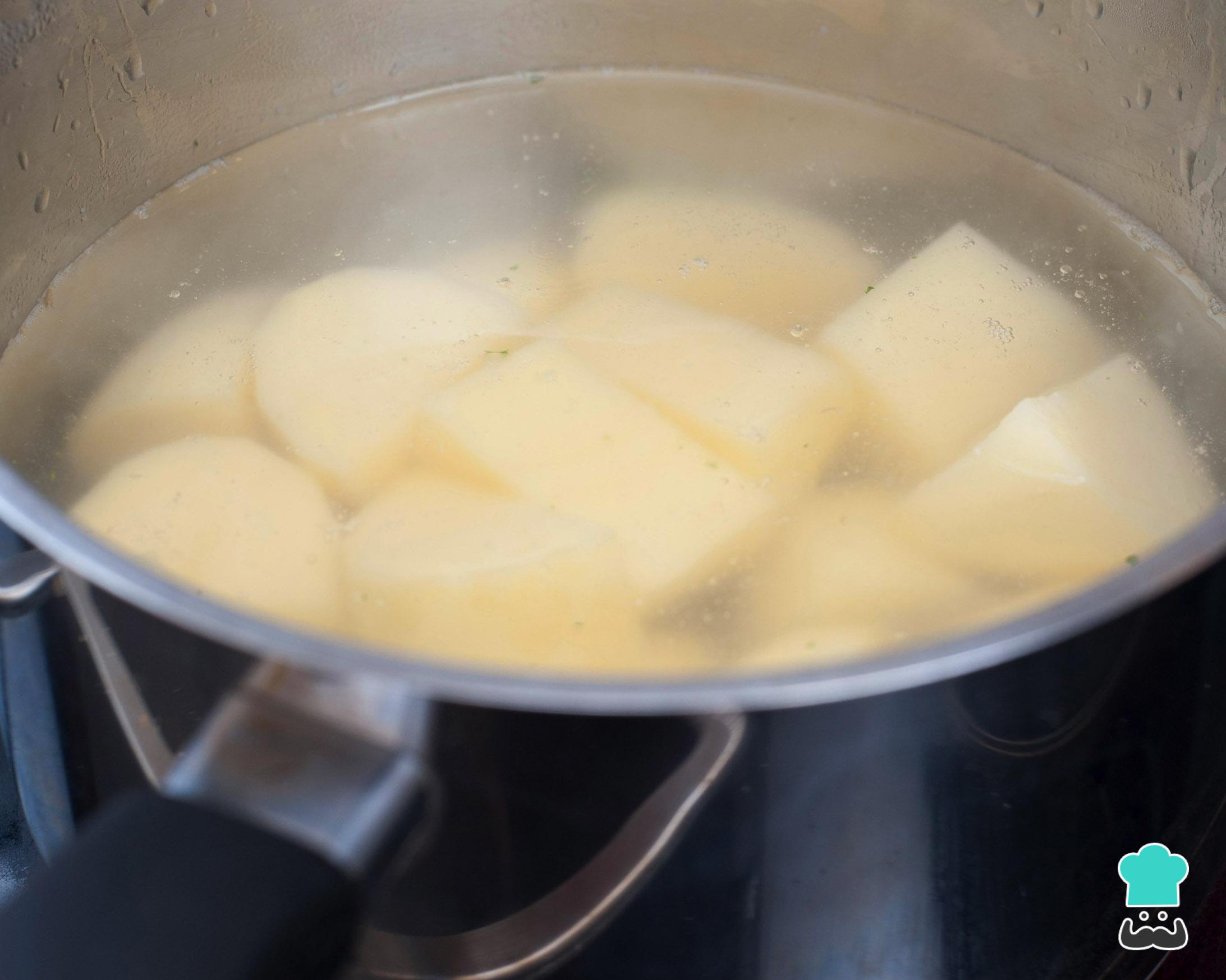 Para fazer este cachorro quente caseiro comece preparando o purê de batata para cachorro quente, que é a etapa mais demorada. Descasque as batatas, corte em pedaços e leve para cozinhar por 15-20 minutos numa panela com água até cobrir e um pouco de sal.