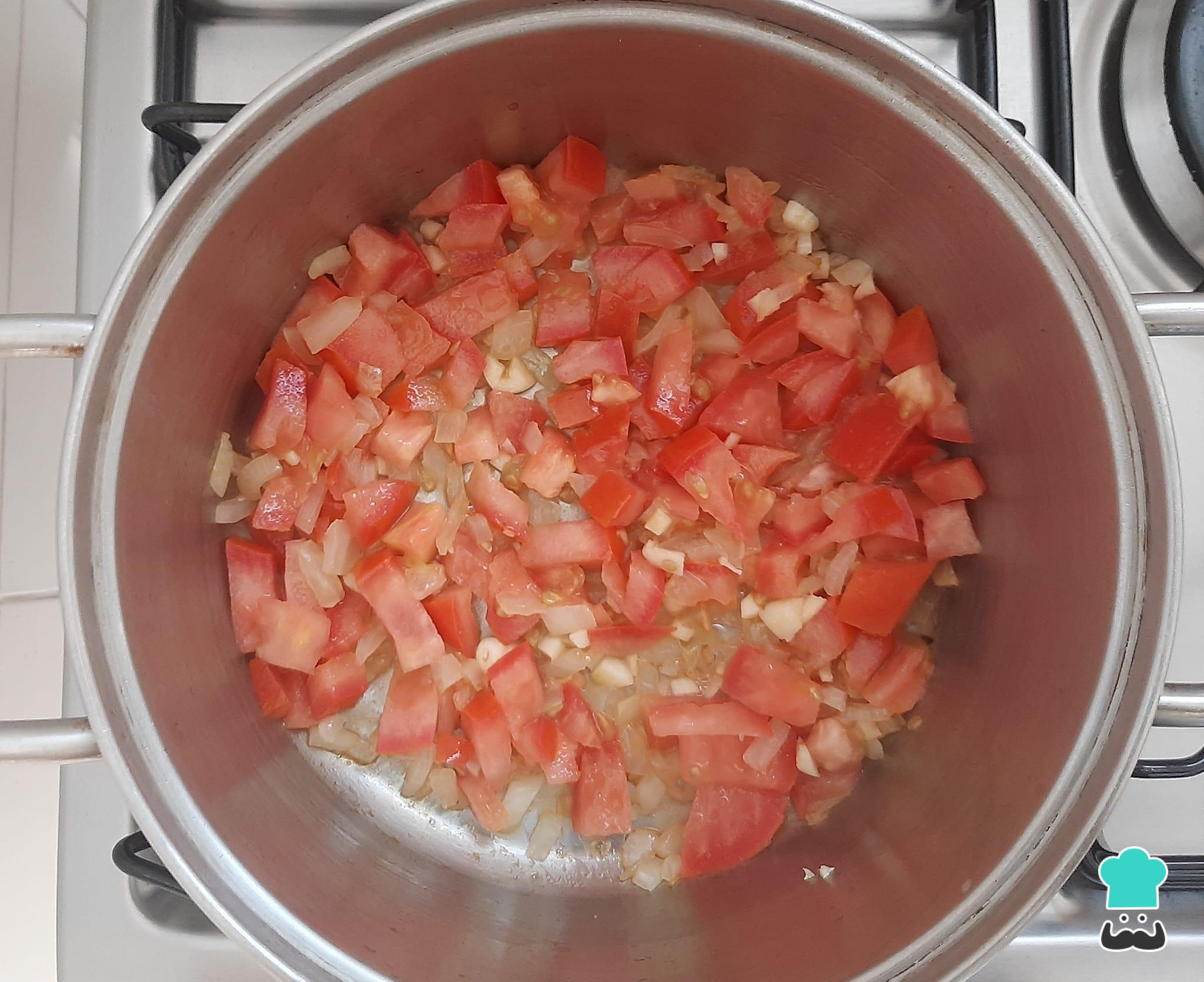 Depois, acrescente o tomate picado e refogue mais um pouco.