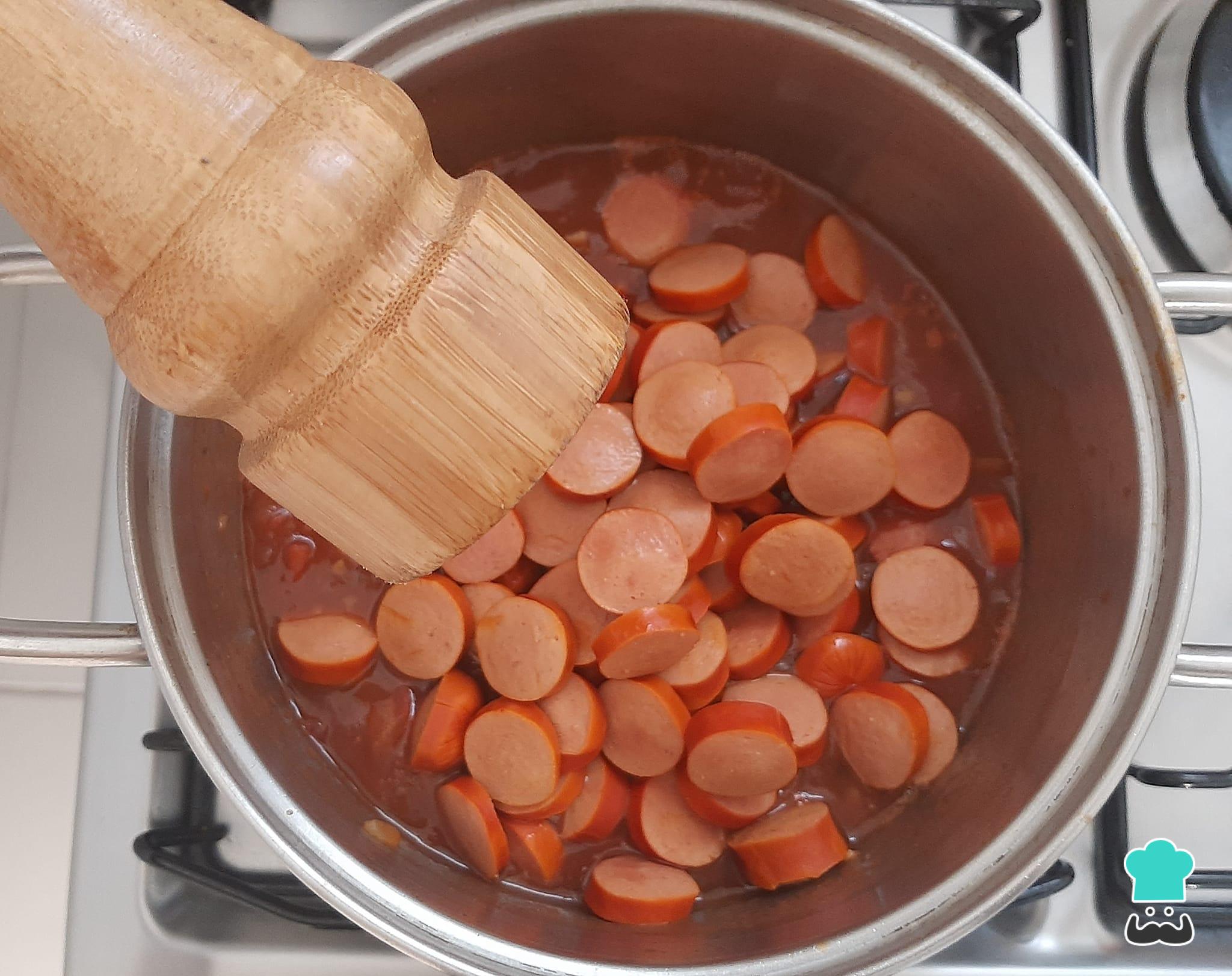 Adicione o molho de tomate, as salsichas e tempere com sal.