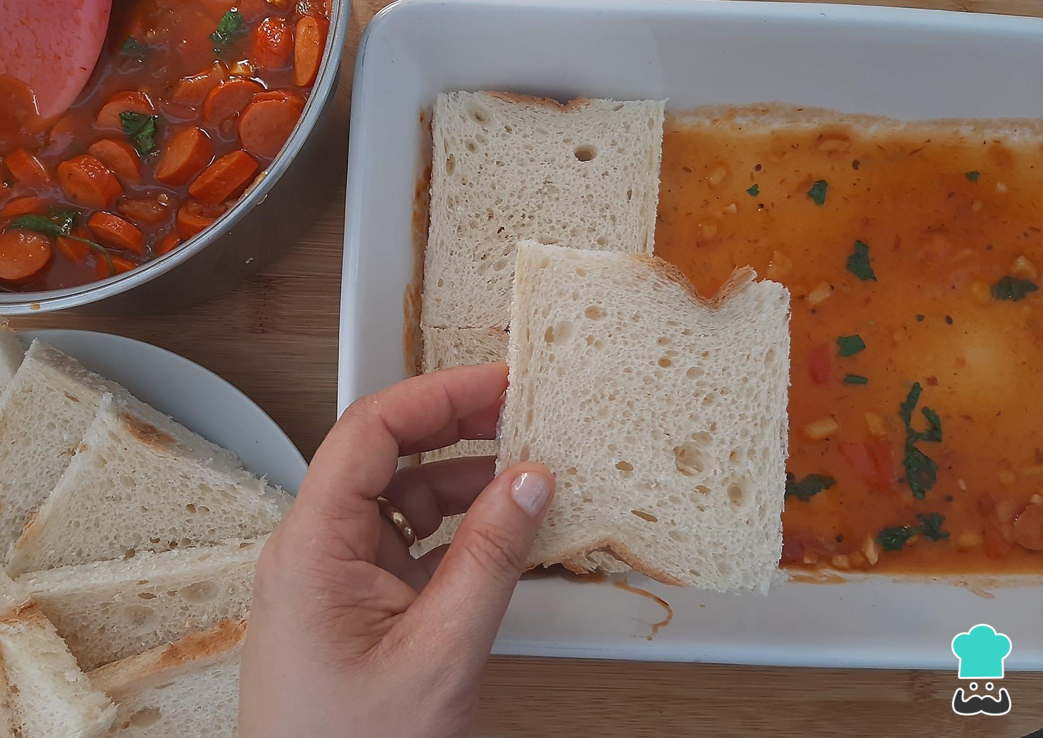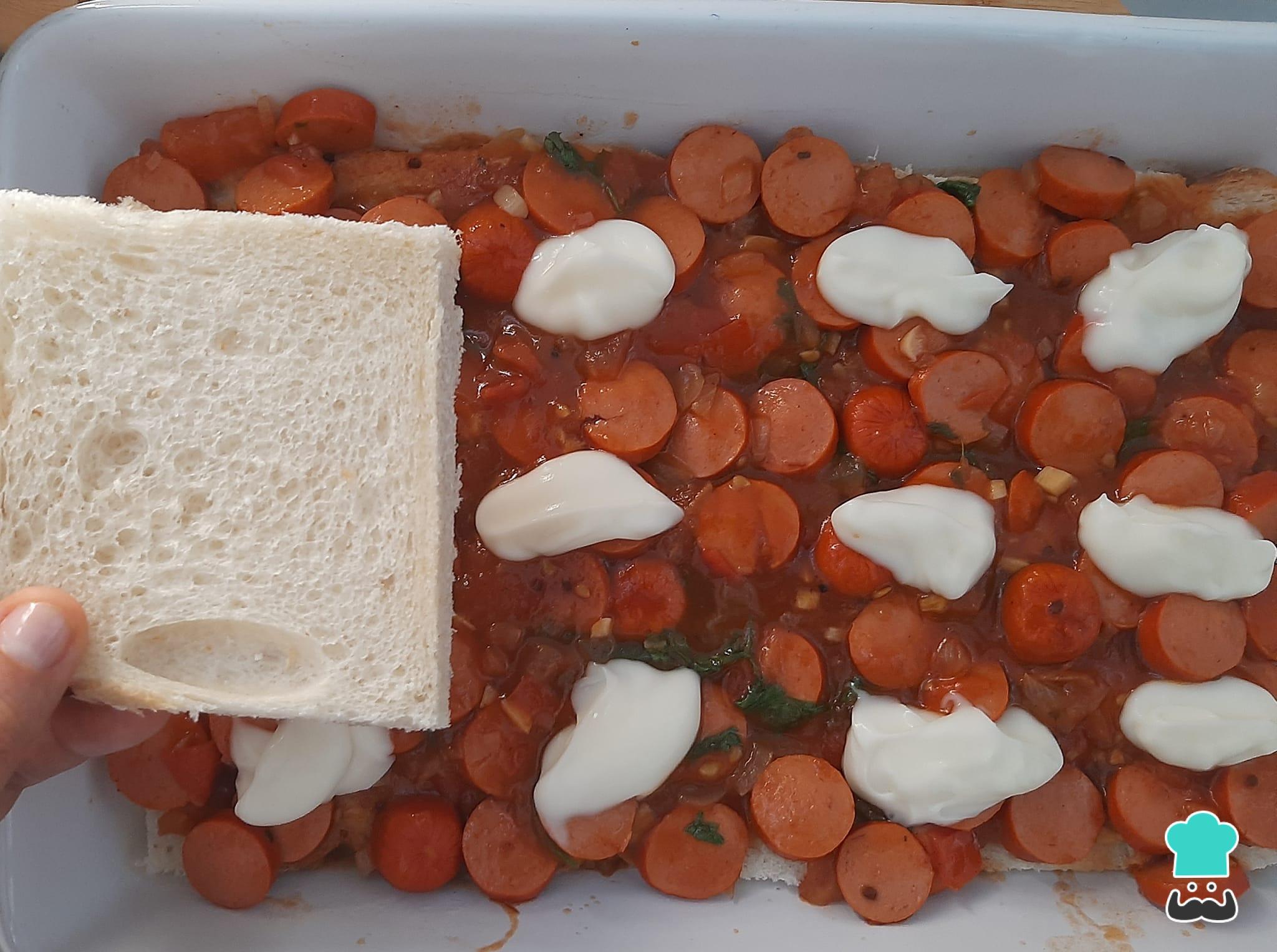 Para montar seu cachorro quente de forno, basta fazer uma camada bem fina de molho (sem salsichas) e acomodar fatias de pão, como mostra a foto abaixo.