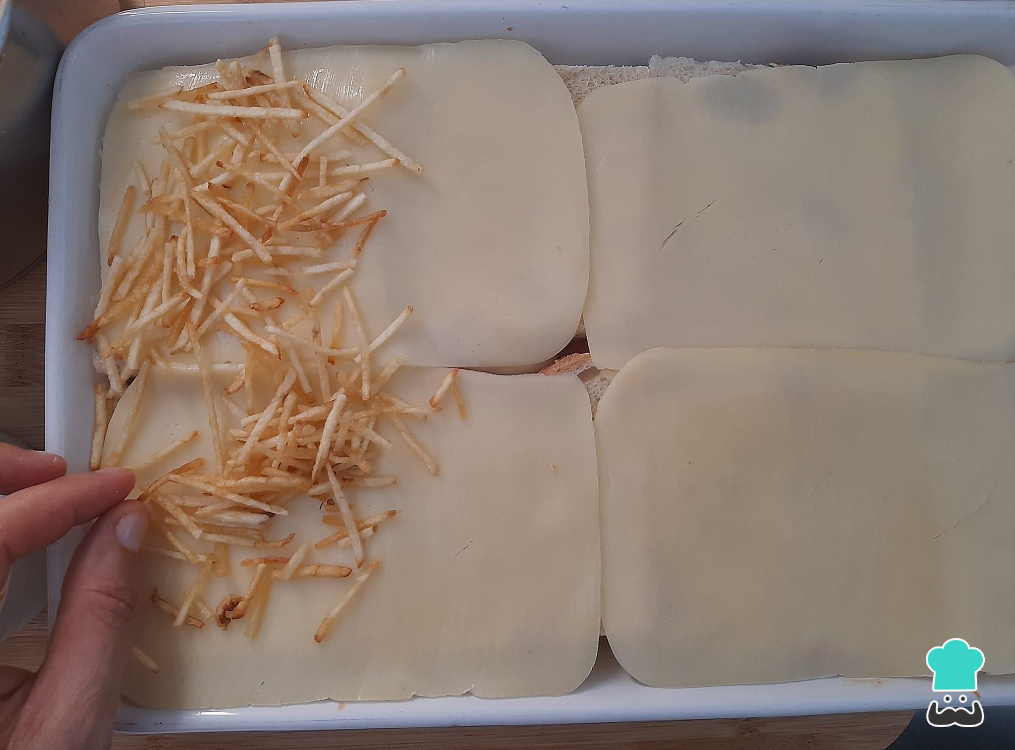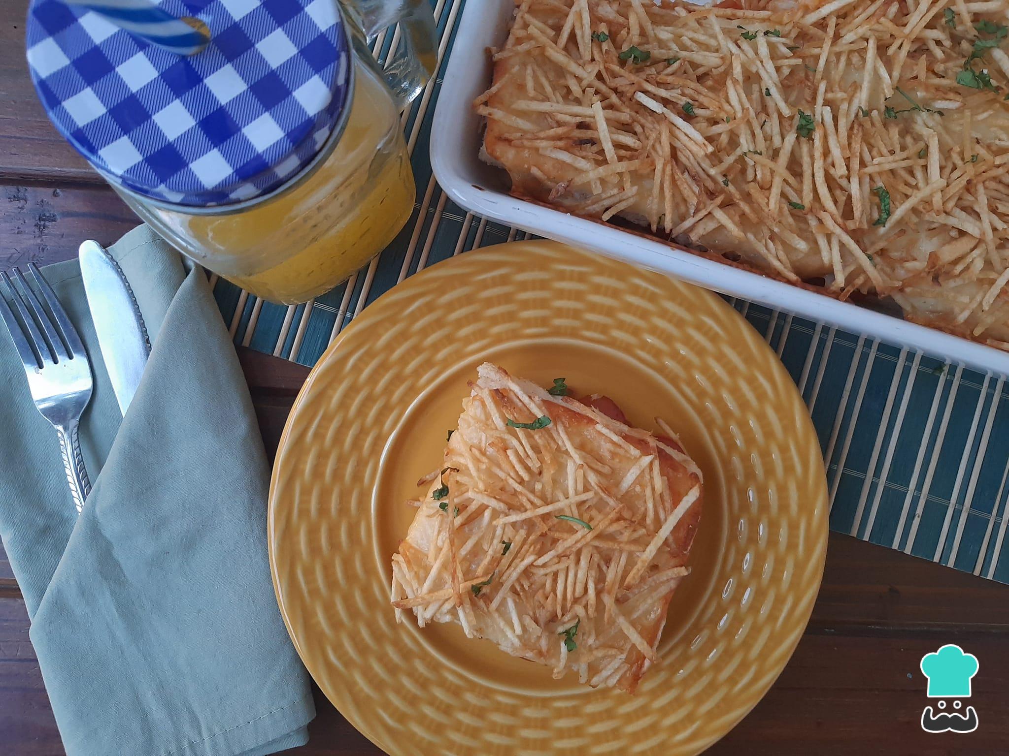 Cubra com o queijo mussarela, decore com batata palha e leve para assar em forno pré aquecido a 180 graus por 15 minutos.
