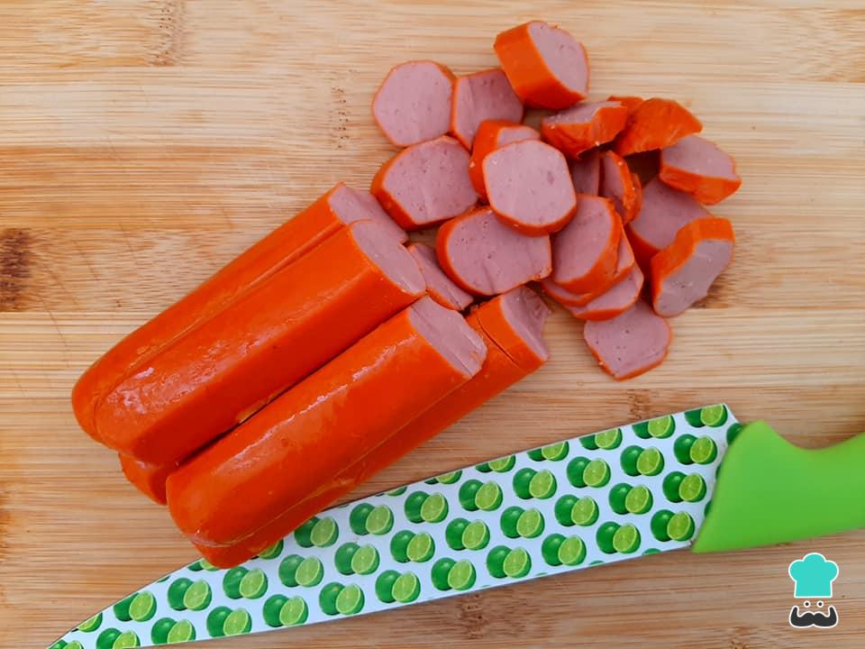 Pique as salsichas em rodelas finas, como na foto.