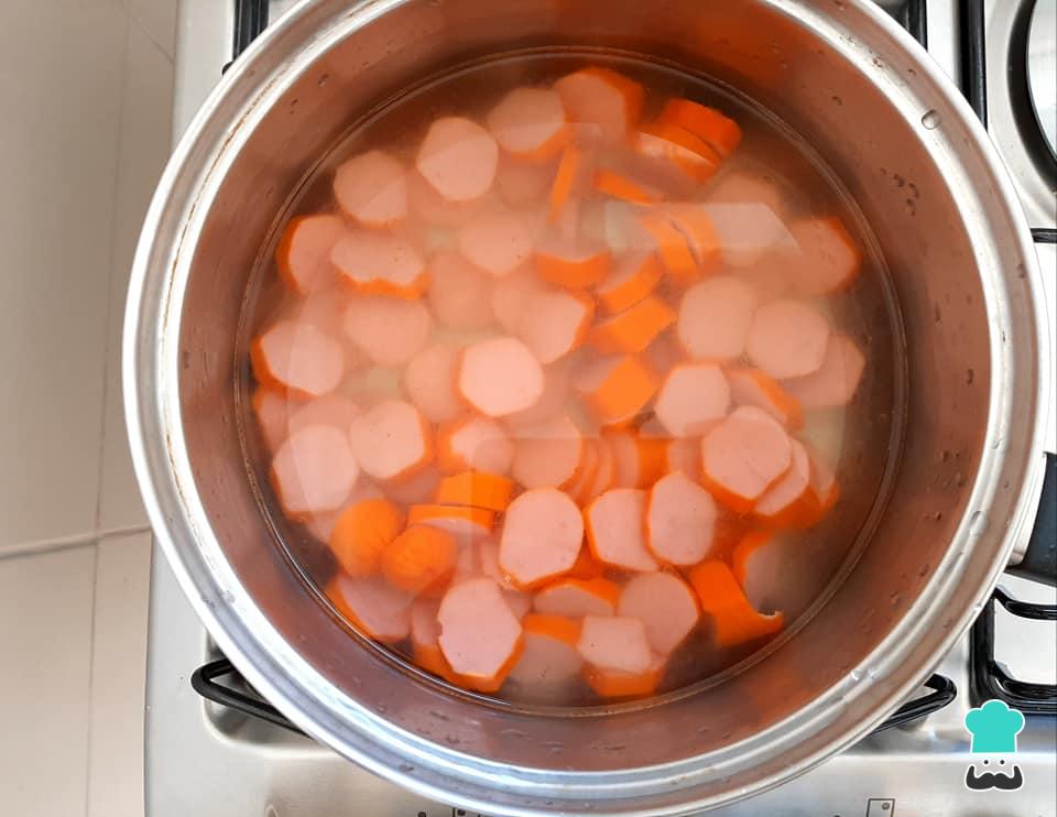 Leve as salsichas para cozinhar por, pelo menos, 5 minutos, a fim de retirar o excesso de corante das mesmas. Após isso, escorra-as e lave-as em água corrente.