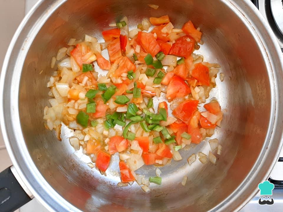 Numa panela média, aqueça o azeite de oliva e refogue primeiro a cebola picada e em seguida o alho. Acrescente o tomate e o pimentão picados, refogando até os legumes murcharem um pouco.