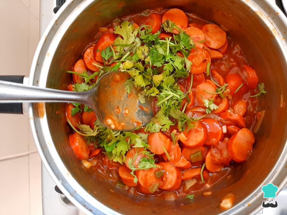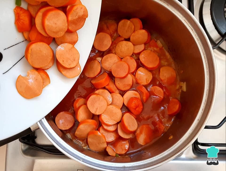 Acrescente o molho de tomate e as salsichas em rodelas. Tempere com sal e pimenta do reino e deixe cozinhando em fogo baixo por alguns minutos, até o molho ficar mais espesso.