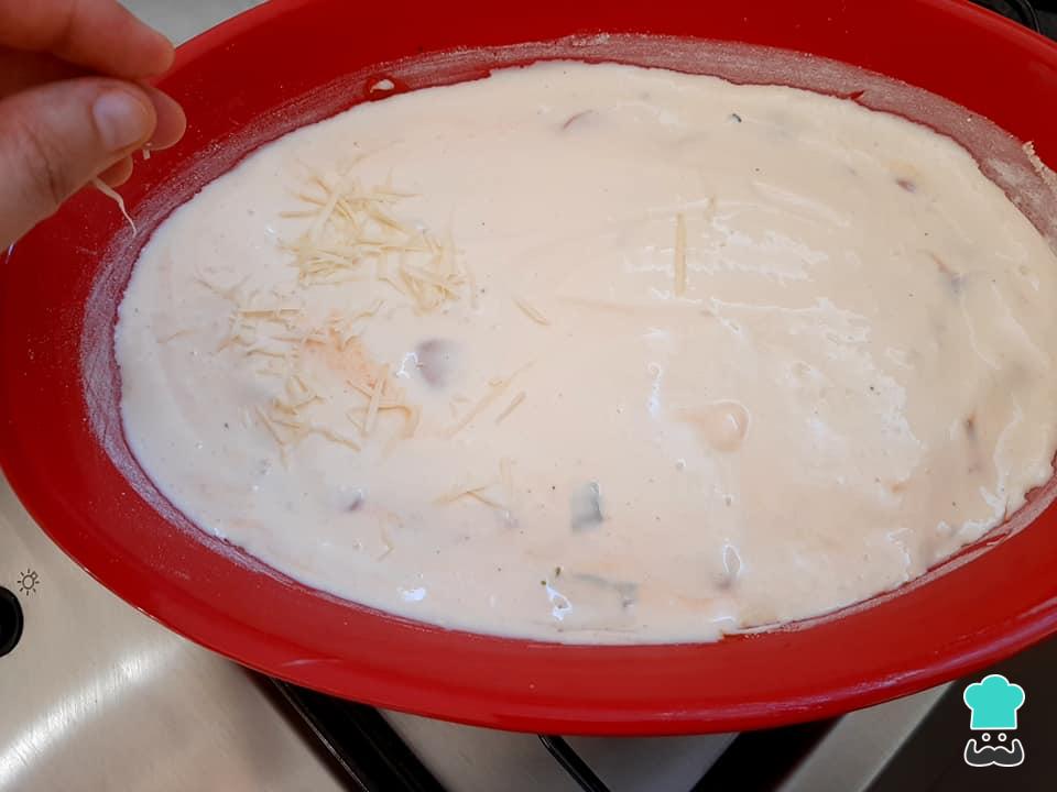Cubra com o restante da massa, espalhando-a bem e polvilhe o queijo parmesão ralado restante. Leve para assar em forno pré aquecido por aproximadamente 30 minutos ou até dourar levemente na superfície.