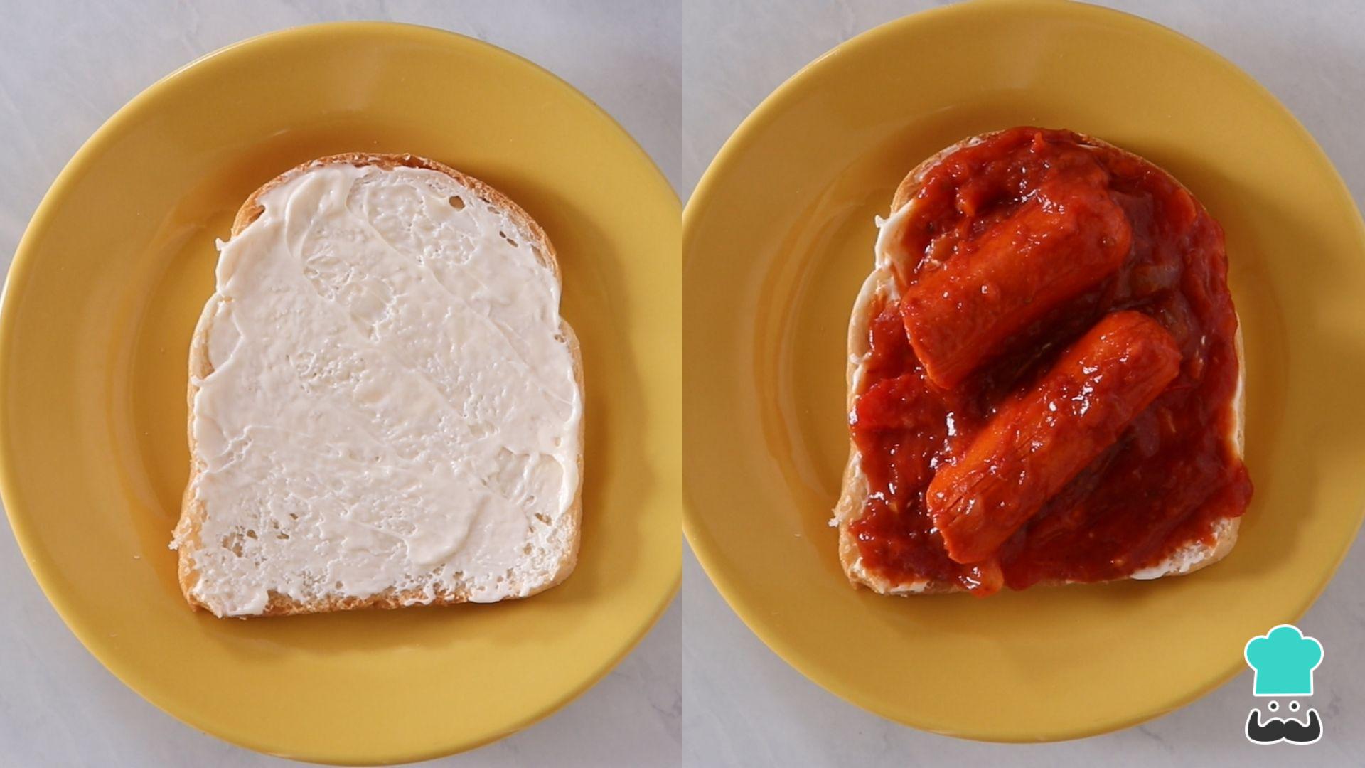 Comece passando maionese no pão e, em seguida, acrescente o molho de salsicha.