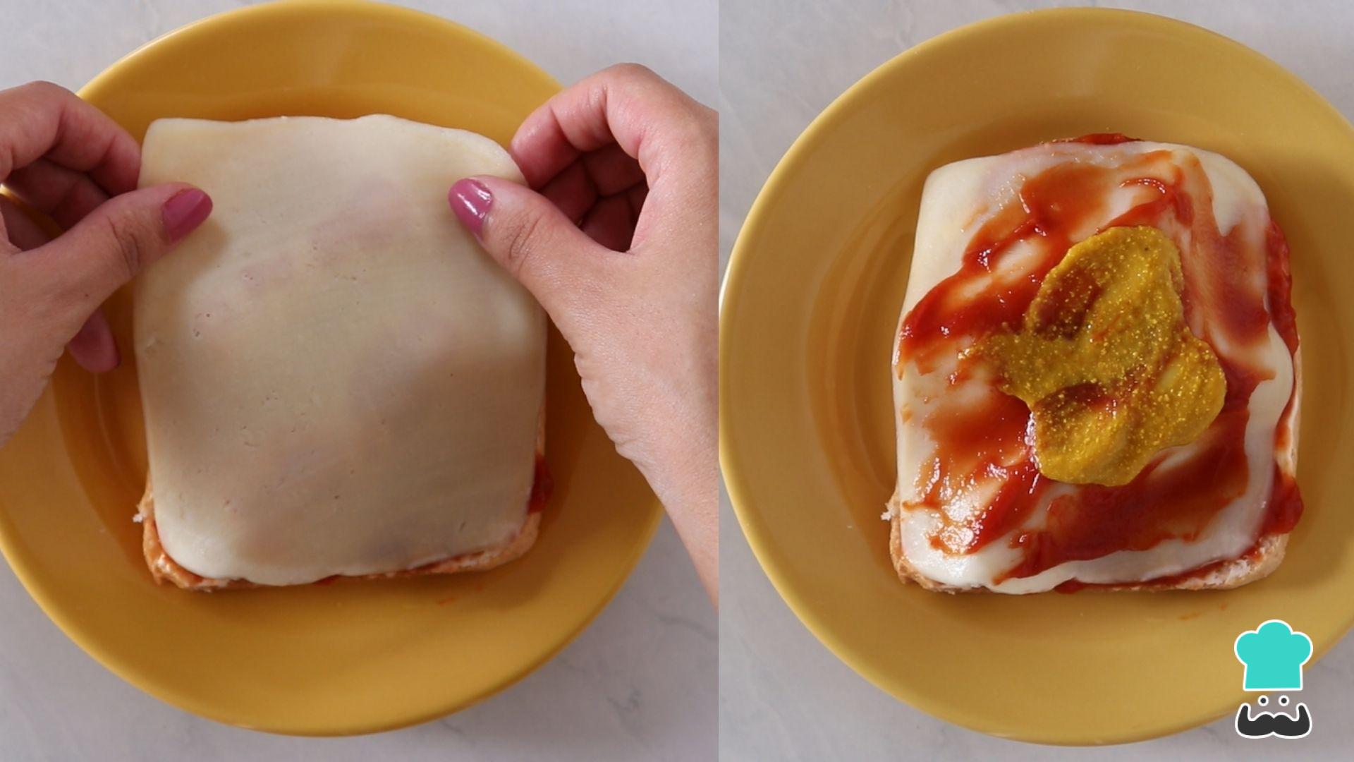 Coloque uma fatia de muçarela, ketchup e mostarda a gosto e finalize com mais uma fatia de pão.