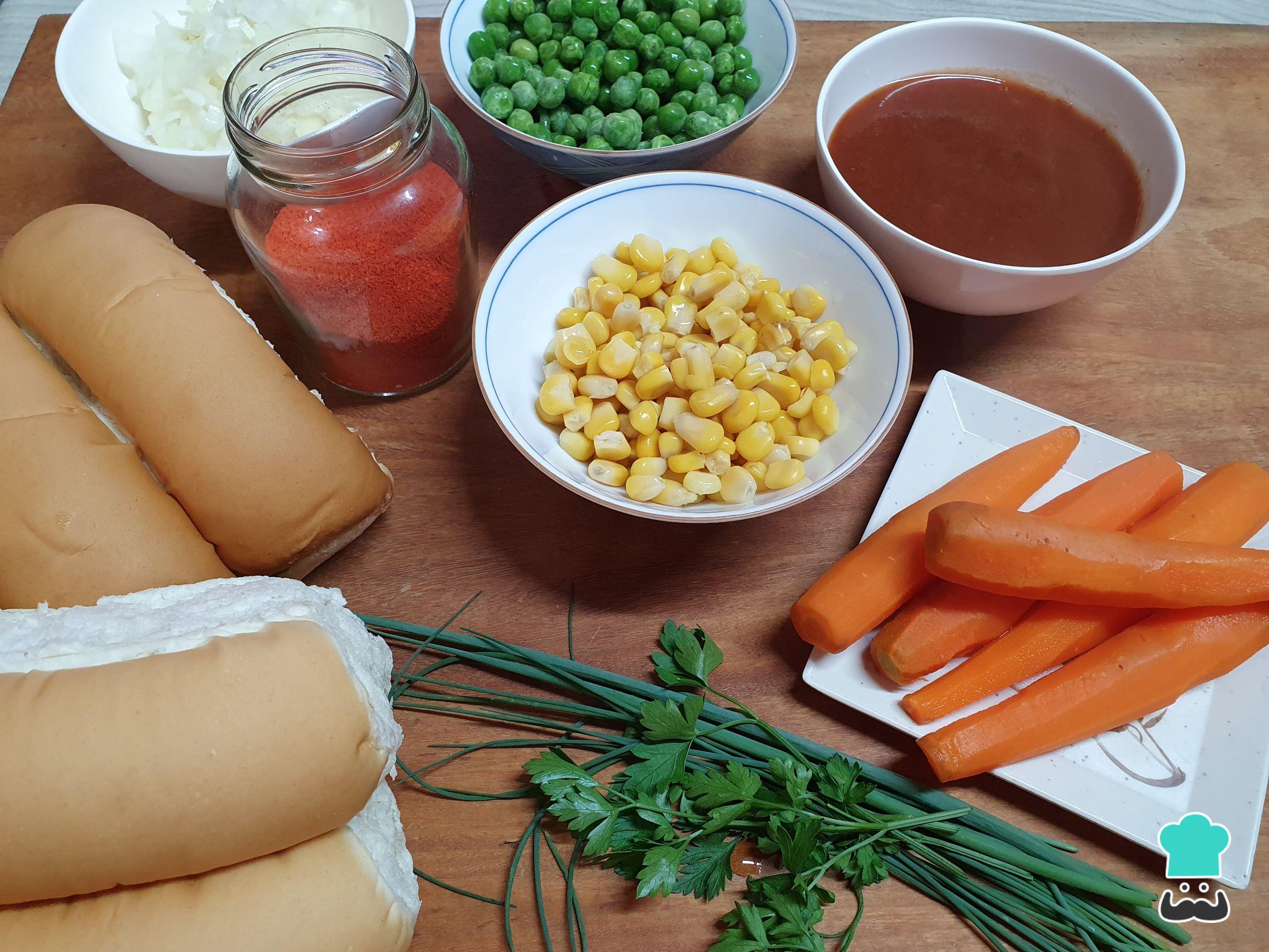 Agora é montar o seu cachorro quente saudável: molhe o pão com o molho de tomates, junte a ervilha e o milho e finalize com a cenoura tostada e o tempero verde por cima.