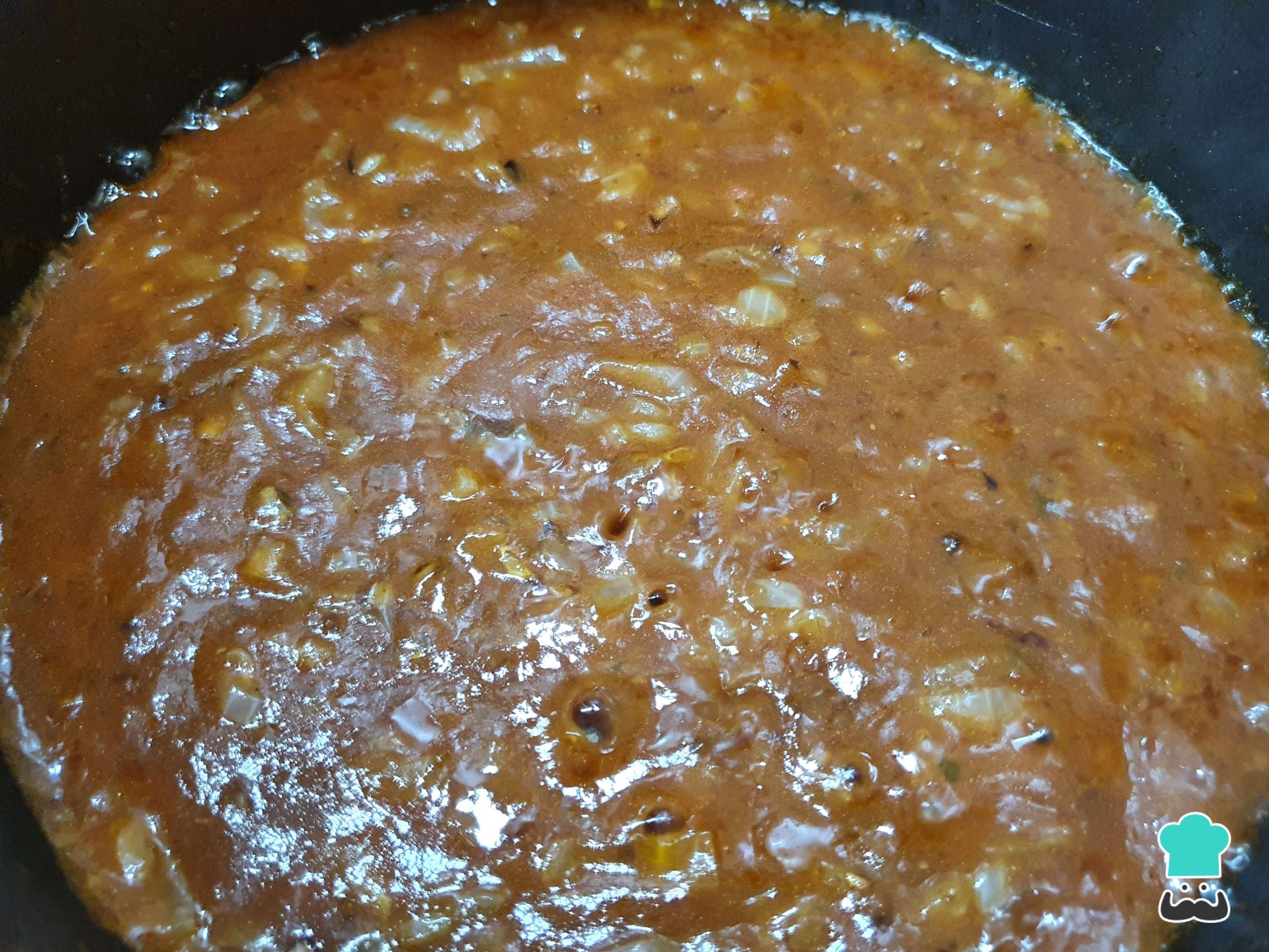 Doure muito bem a cebola em azeite numa panela no fogo médio e misture o molho de tomates.