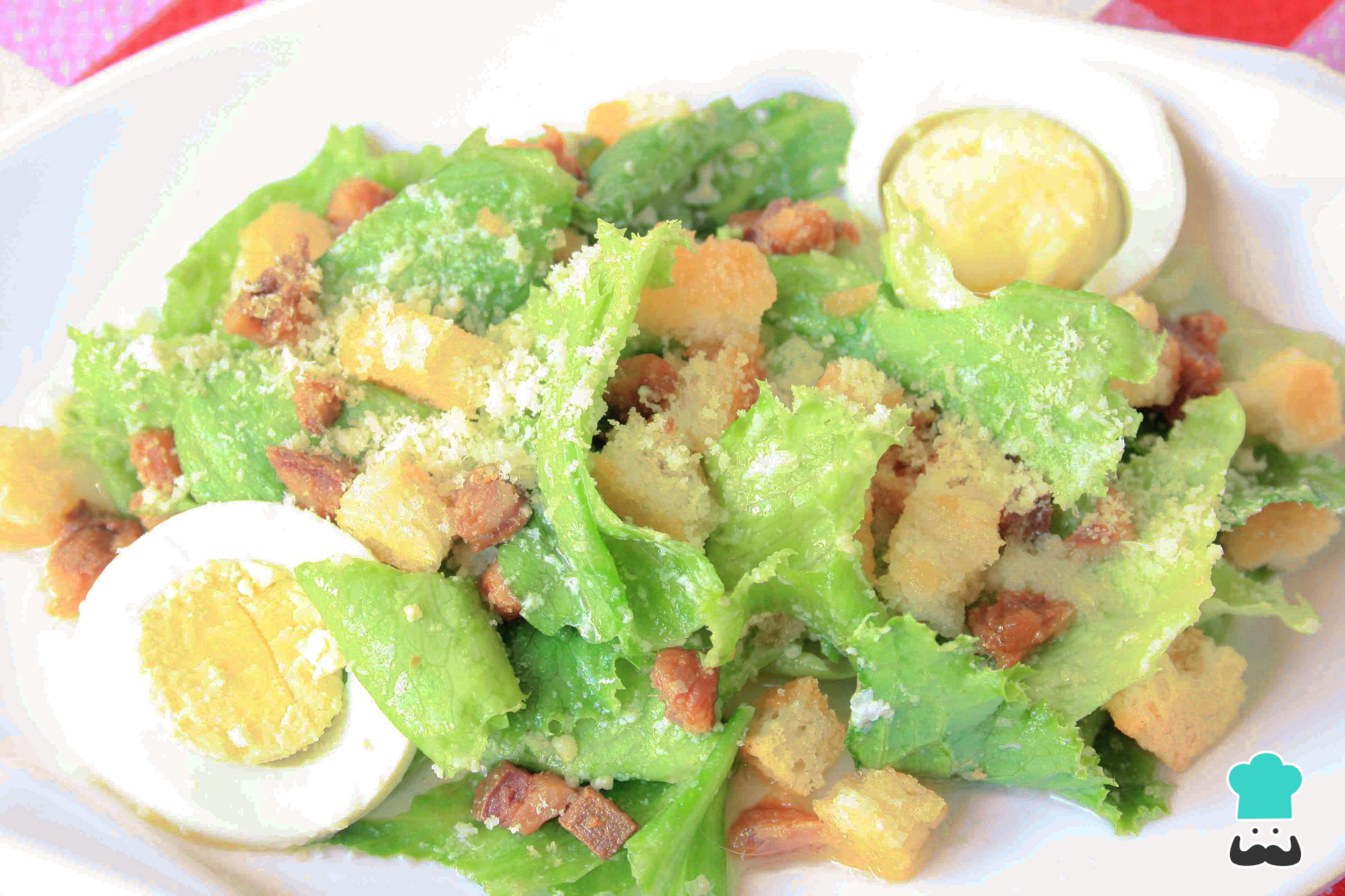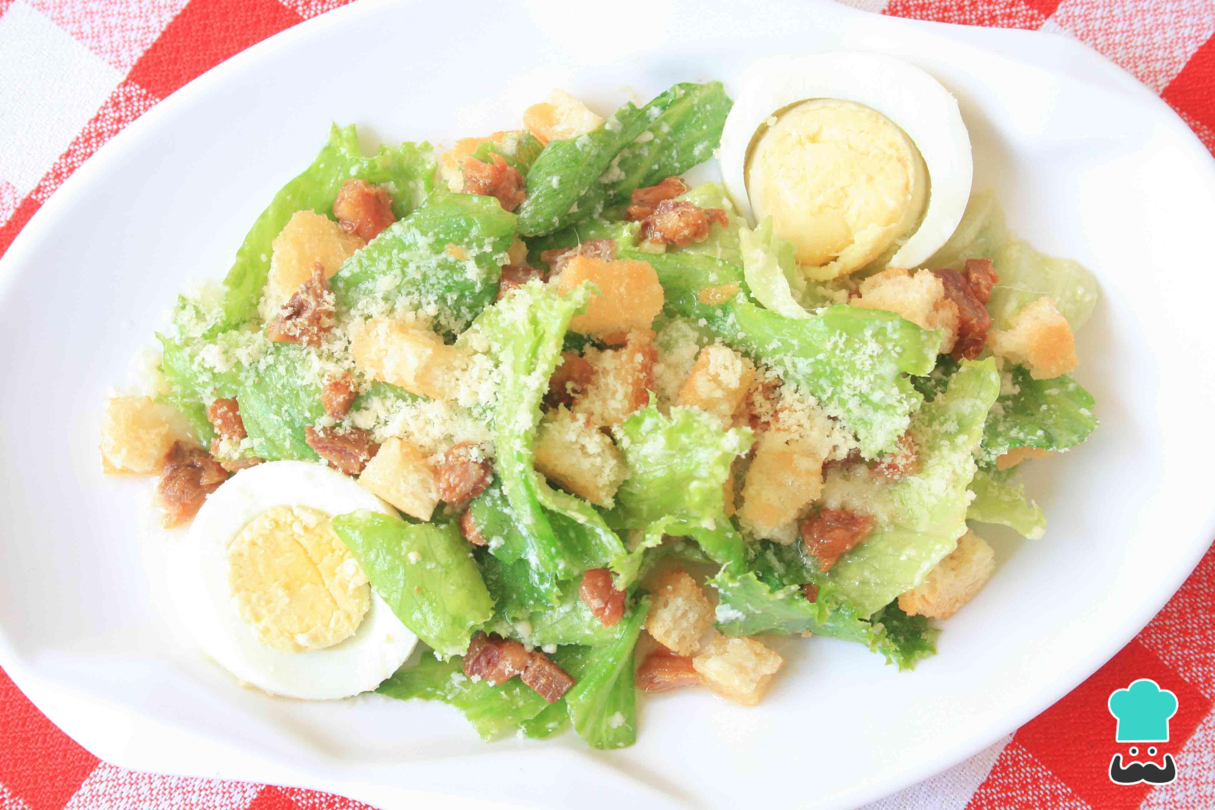 A Caesar salad tradicional tem como ingredientes principais alface (de preferência alface romana), croutons, queijo parmesão, anchovas, azeite de oliva e suco de limão. Aqui no TudoReceitas completamos a receita de Caesar salad (salada grega) com ovo cozido e alho. Confira abaixo o preparo passo a passo em fotos e faça esta versão simples, econômica e gostosa dessa salada saborosa e refrescante!