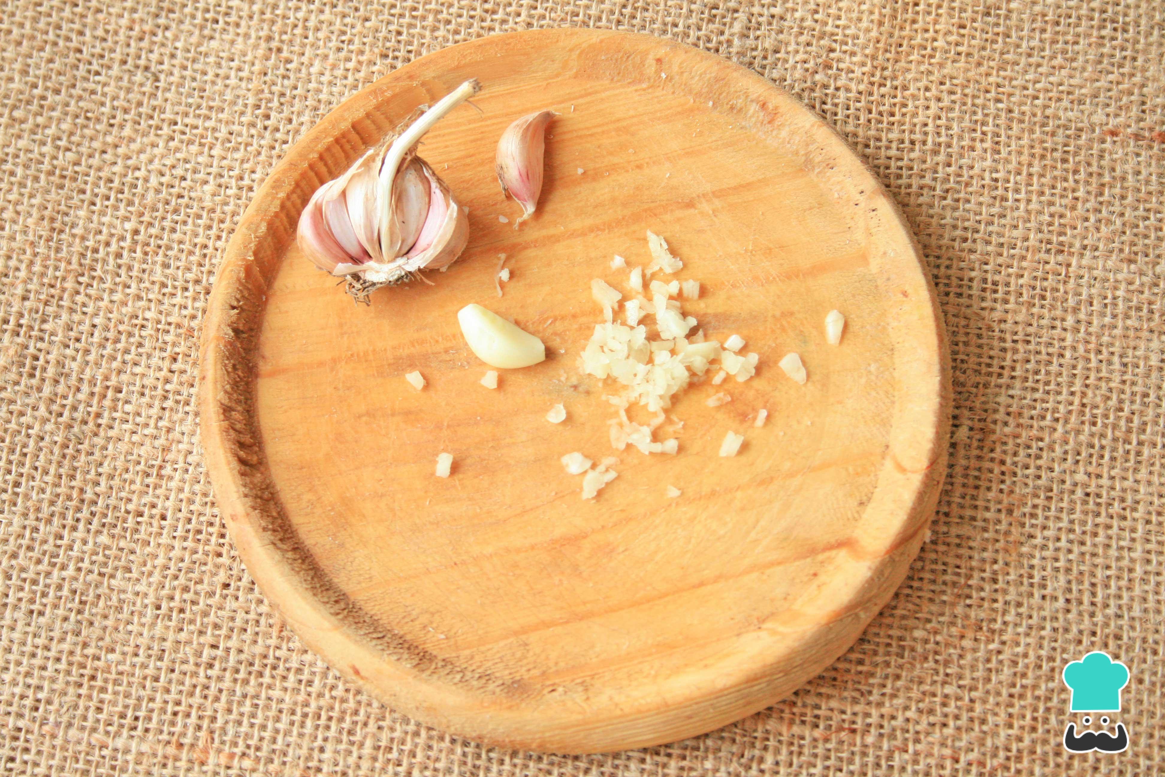 Corte ou pique finamente os 3 dentes de alho descascados. Este também é um ingrediente opcional, no entanto será usado para conferir mais sabor aos croutons.