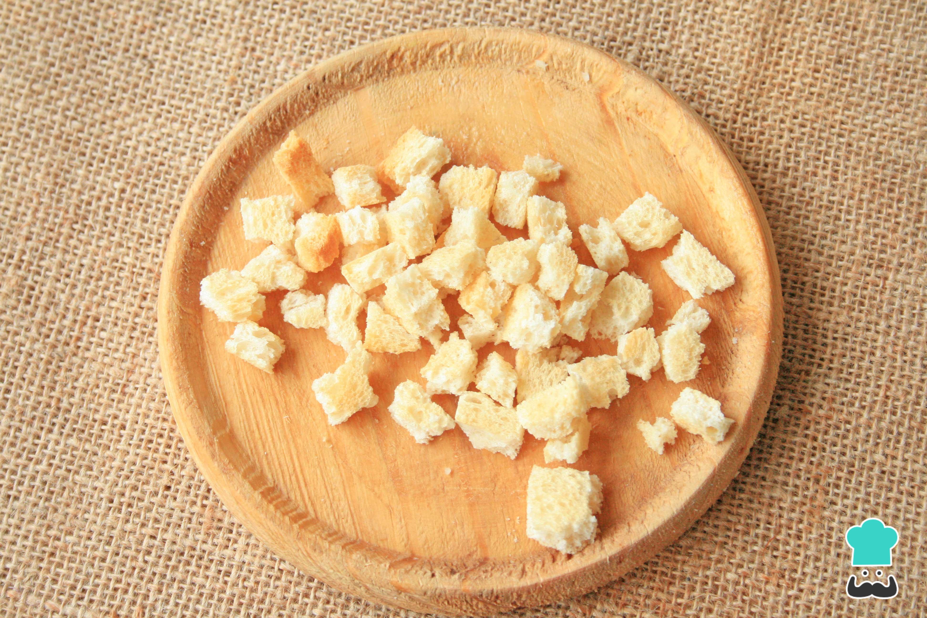 Quanto aos croutons, você pode comprar prontos ou preparar croutons caseiros com miolo de pão cortado em cubinhos, o que é uma excelente opção caso você tenha pão amanhecido em casa.