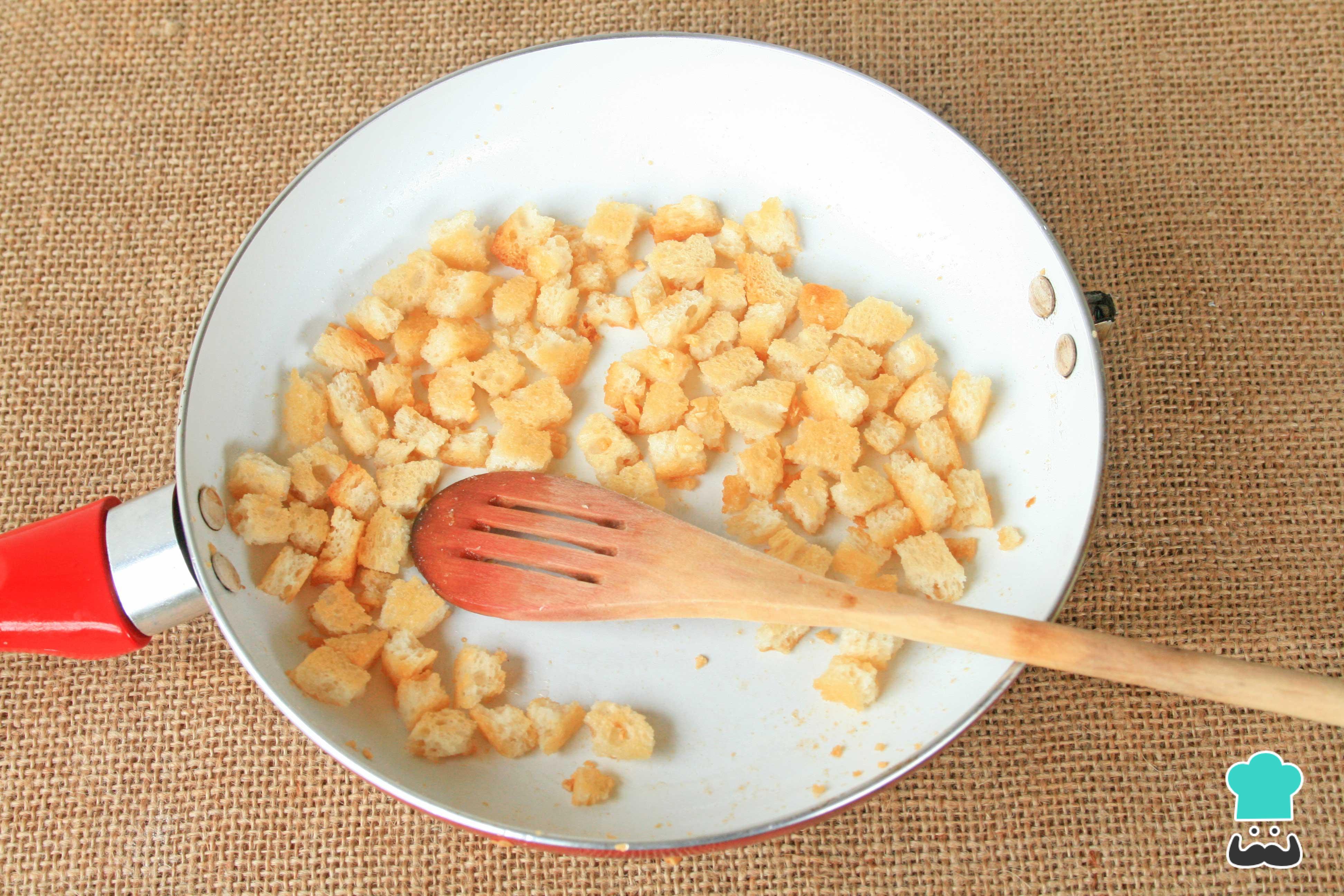 Leve ao fogo uma frigideira ou panela com um fio de óleo e frite ligeiramente os alhos sem deixar dourar nem queimar. Adicione os croutons ou miolo de pão e misture, deixando cozinhar até ficarem dourados, mexendo de vez em quando. Reserve.