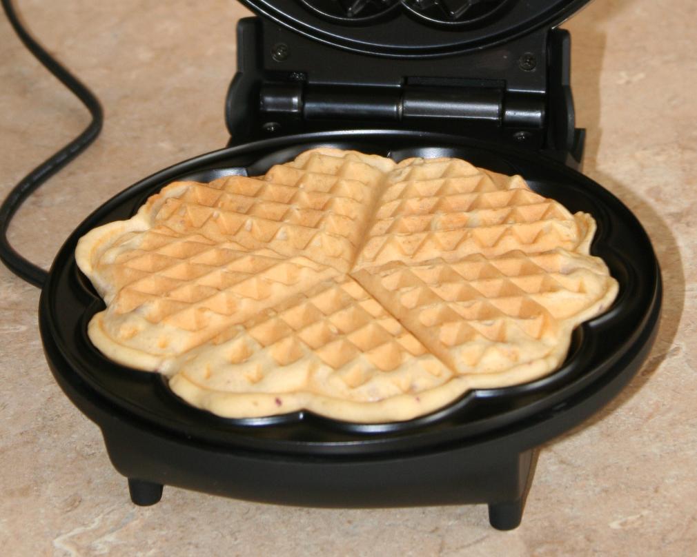 Esquente a máquina de waffles, que neste caso será melhor se fizer waffles em forma de coração, como na foto. Coloque a massa de waffles caseiros e deixe assar até ficar pronta.
