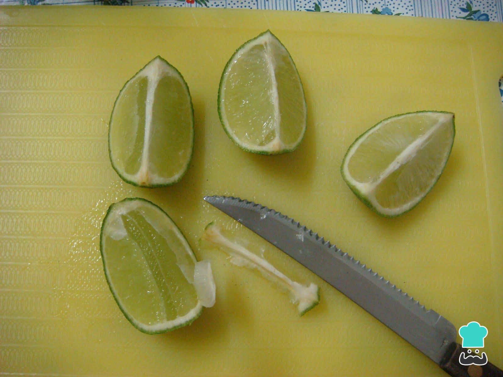 Para preparar esta receita de caipirinha corte as extremidades do limão, corte-o em 4 partes e retire a parte branca do miolo.