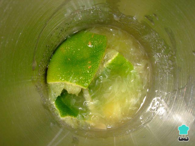 Divida o limão por dois copos e acrescente o açúcar. Amasse com um socador de madeira.