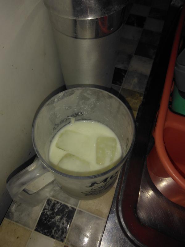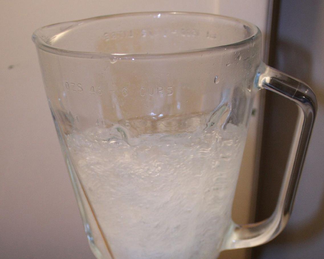 - Bata 10-12 cubos de gelo com 8 colheres de sopa de açúcar no liquidificador;